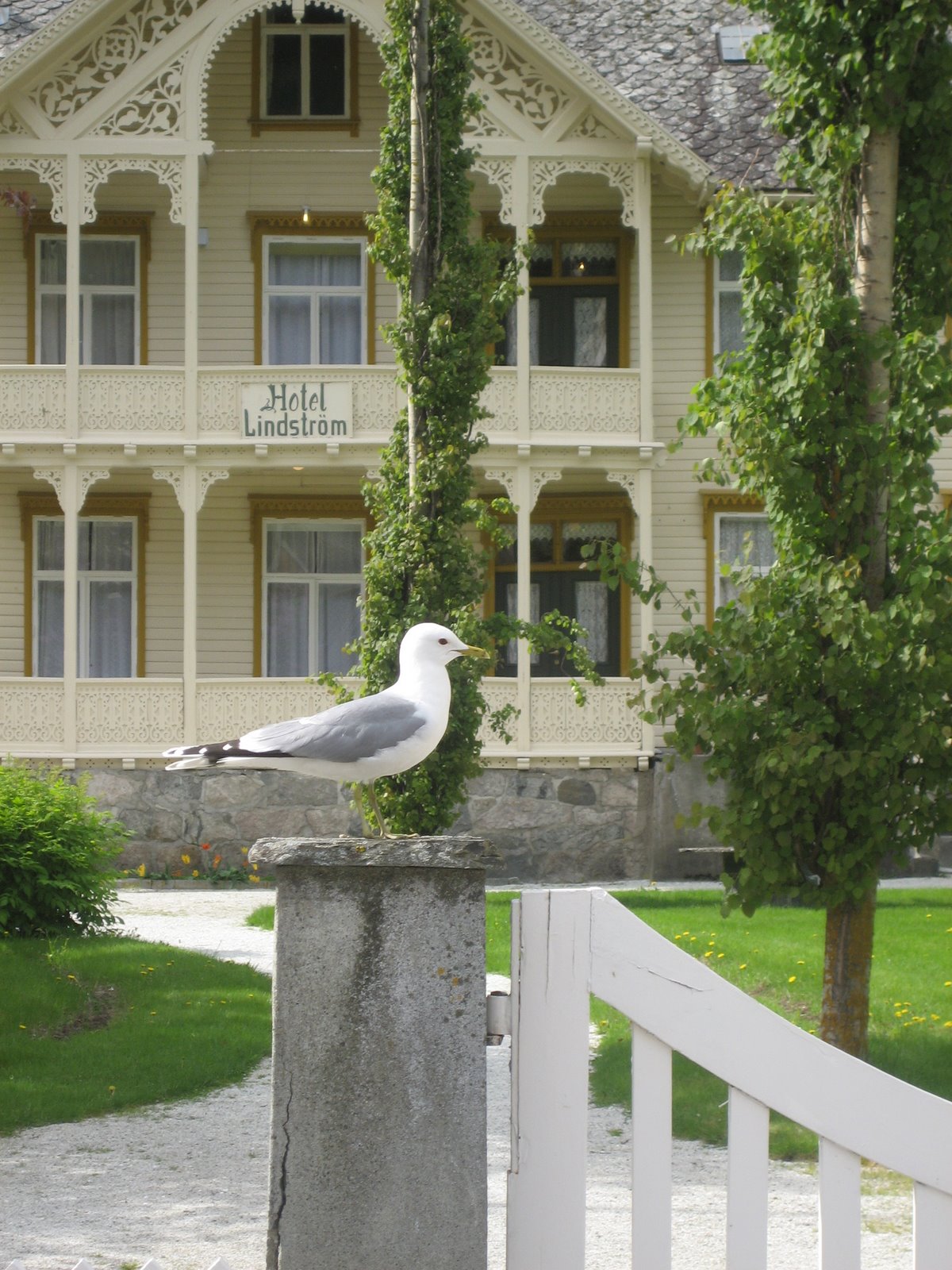 Vi tok en kveldstur med hundene inn til sentrum og ruslet rundet i gatene, og vi gikk tilbake neste morgen, både for turens skyld og fordi vi måtte handle brød. Det er den reneste peneste småbyen vi har sett her i landet, vi lo litt og sa med oss selv av vi skulle tro vi var i utlandet ! Velstelte hager med duftende syriner, nyklipte offentlige plener og ikke så mye som et fnugg av boss noe steder. Til og med måsen satt så pent og pyntelig og poserte på portstolpen !