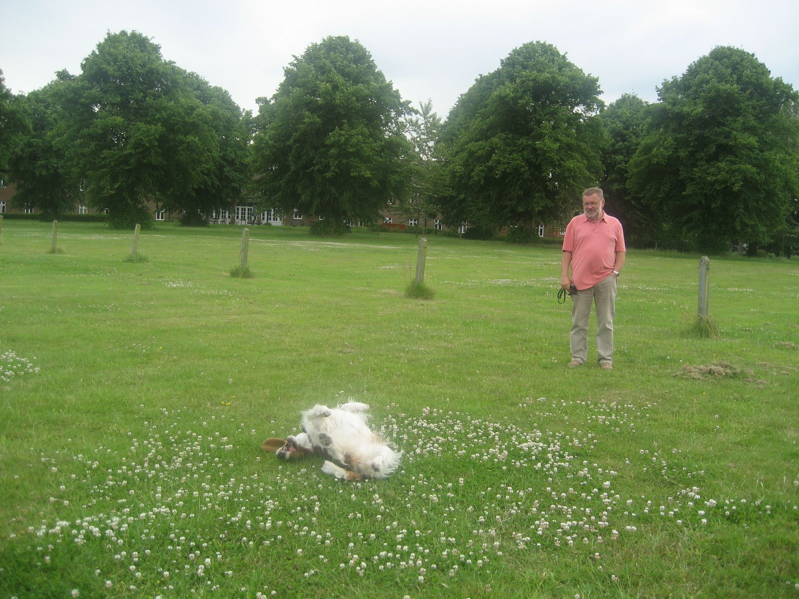 På bildet i midten er vi på besøk hos granny og ruller oss på plenen bak huset hvor granny bor. Det ligger i et sted som heter Whiteley Village og der er det store parker, rugbybane, bowls bane og stor innsjø. Som dere ser er det helt fantastisk bare å rulle seg i kløverengen der.