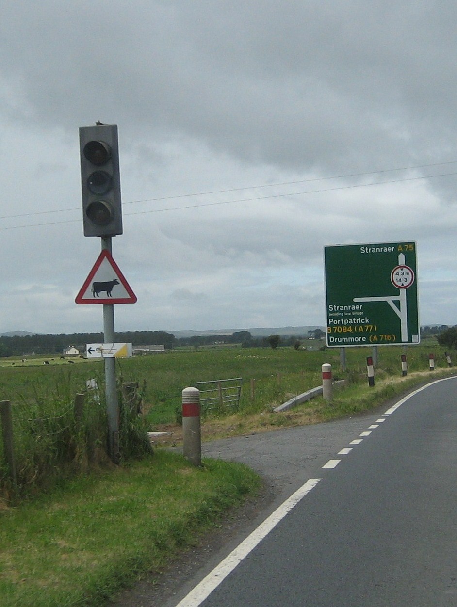 Så drar vi videre til Stranrear hvor fergen til Irland går. Det blåser fremdeles kraftig så lenge før vi kommer til sjøen har Mona allerede erklært at noen kryssing er ikke aktuelt i dag. I mellomtiden kan vi ikke la vær å humre over egne trafikklys for kuer – Skottland er jo berømt for biff-kjøtt så kuene må passes godt på. Det er jo så kjekt å kjøre langs landeveien og se alle dyrene som er ute på engen og koser seg. Ikke alle er så heldig som kuene som har egne lys-kryss
