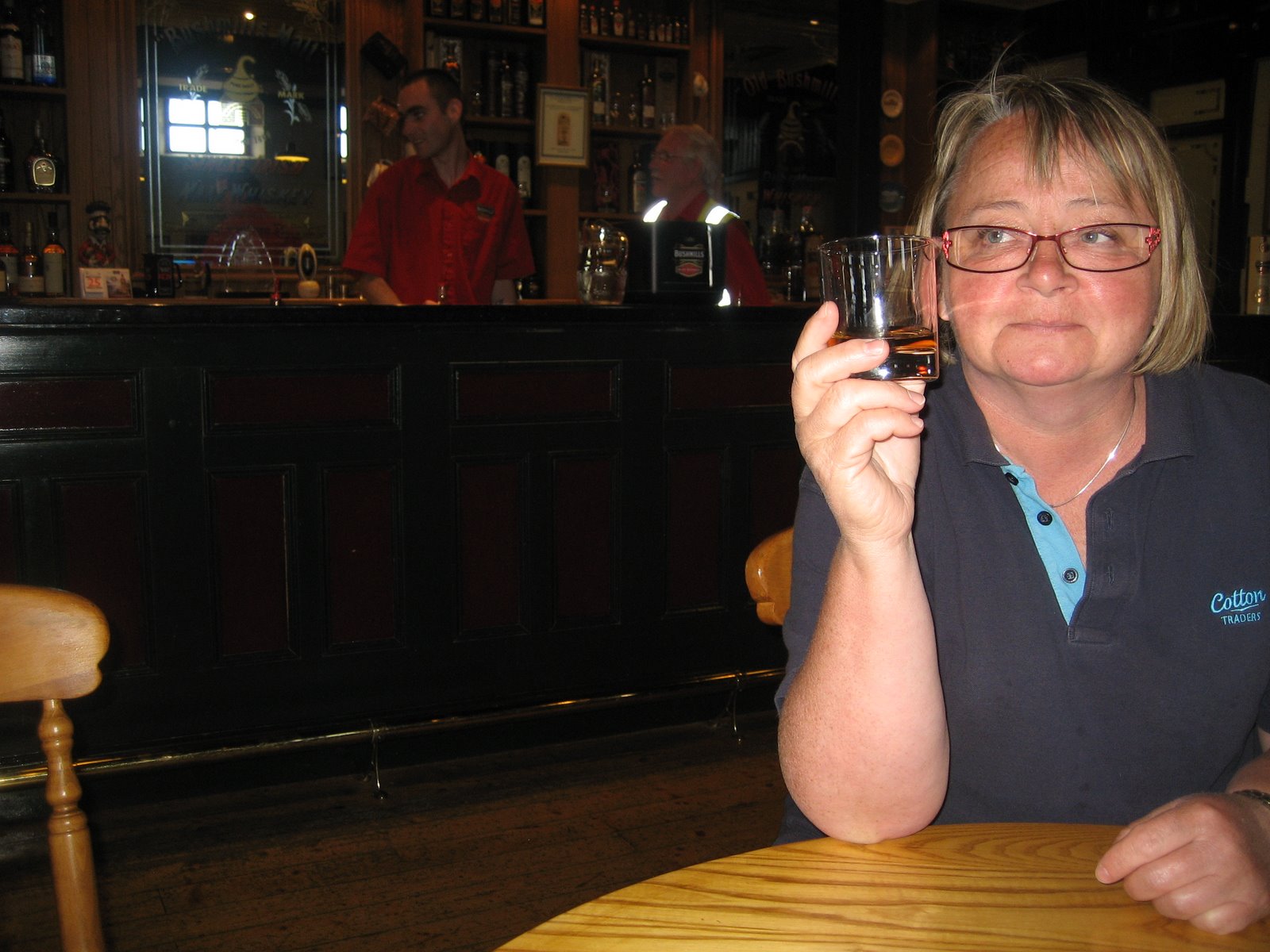 e hvor whiskyen blir lagret i år etter år. Det var foto-forbud i hele fabrikken så dette fikk vi ikke ta bilder av. Tilslutt ble vi tatt med i baren hvor vi fikk en gratis smaksprøve og da ble du jo i fin stemning til å gå videre til butikken, der Ray selvfølgelig MÅTTE kjøpe en spesiell whiskey som de bare solgte her på distilleriet og ikke er til salgs i butikkene. Snakk om special label. Da vi skal gå ser vi at de holder på å laste opp den brukte bygg-massen som er brukt til gjæringen inn på tanken til en trailer. Vi spør hva de skal gjøre med den og får til svar at den fores til noen «lykkelige kuer». Ellers er her ikke så mye å se i Bushmill, men som sagt, campingplassen er en perle. Men i morg