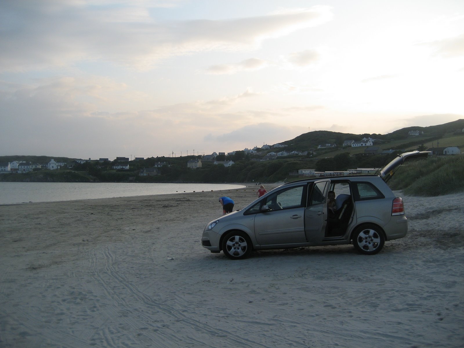 Kjører til Downings og blir veldig skuffet da vi ser campingplassen – full av gamle ustelte faste campingvogner. Men vi har ingen andre steder å dra så sent på dagen så vi betaler 25 euro og finner oss en plass i den lille delen som er reservert for tur-folk. Bakerst uten utsikt over stranden. Stranden er fantastisk – milelang – og så fast at folk kjører bil ut til vannkanten ! Det har vi aldri sett før. Det virker ikke som vannet er altfor varmt – de fleste voksne har våtdrakt på men der er noen unger som går uti. Vi orket ikke gå til vannkanten – det var altfor langt og vi kunne ikke akkurat kjøre bobilen ut ! Det er fint vær og vi blir tørst og går til nærmeste pub (aldri langt) og den er full av mannfolk som hyler og banner