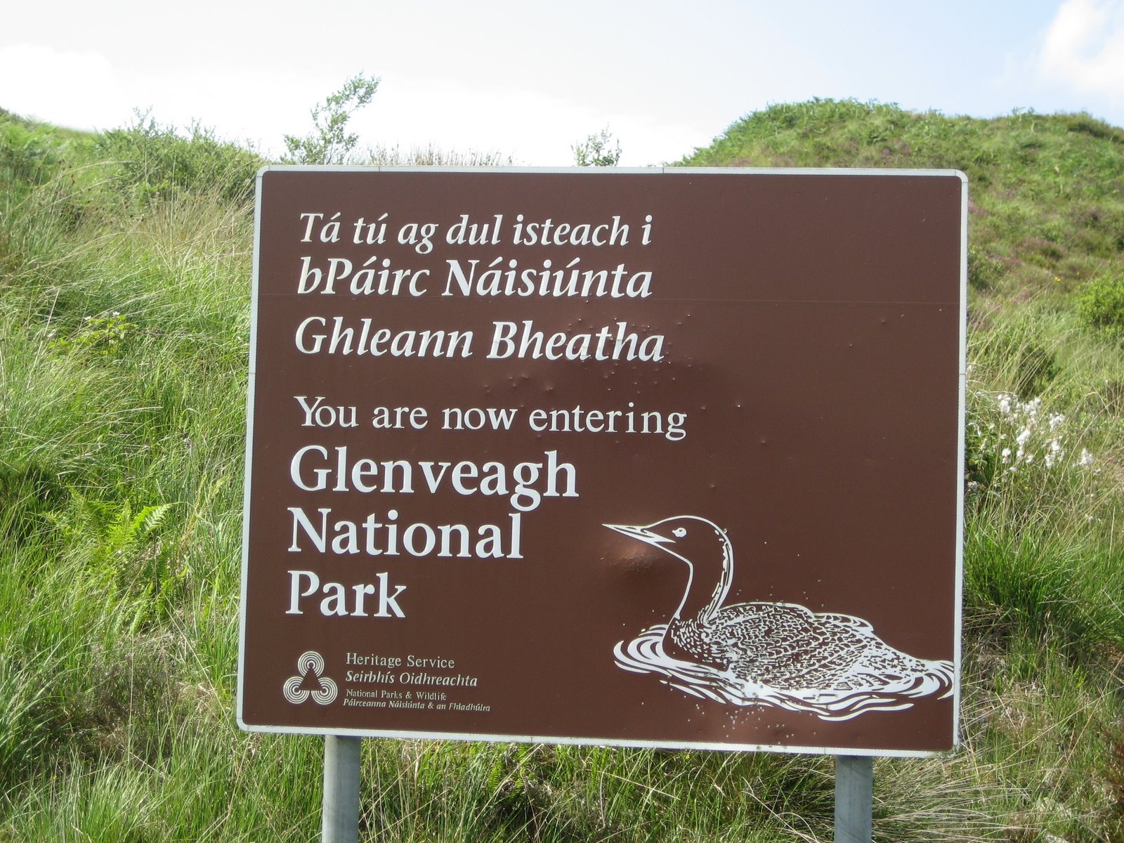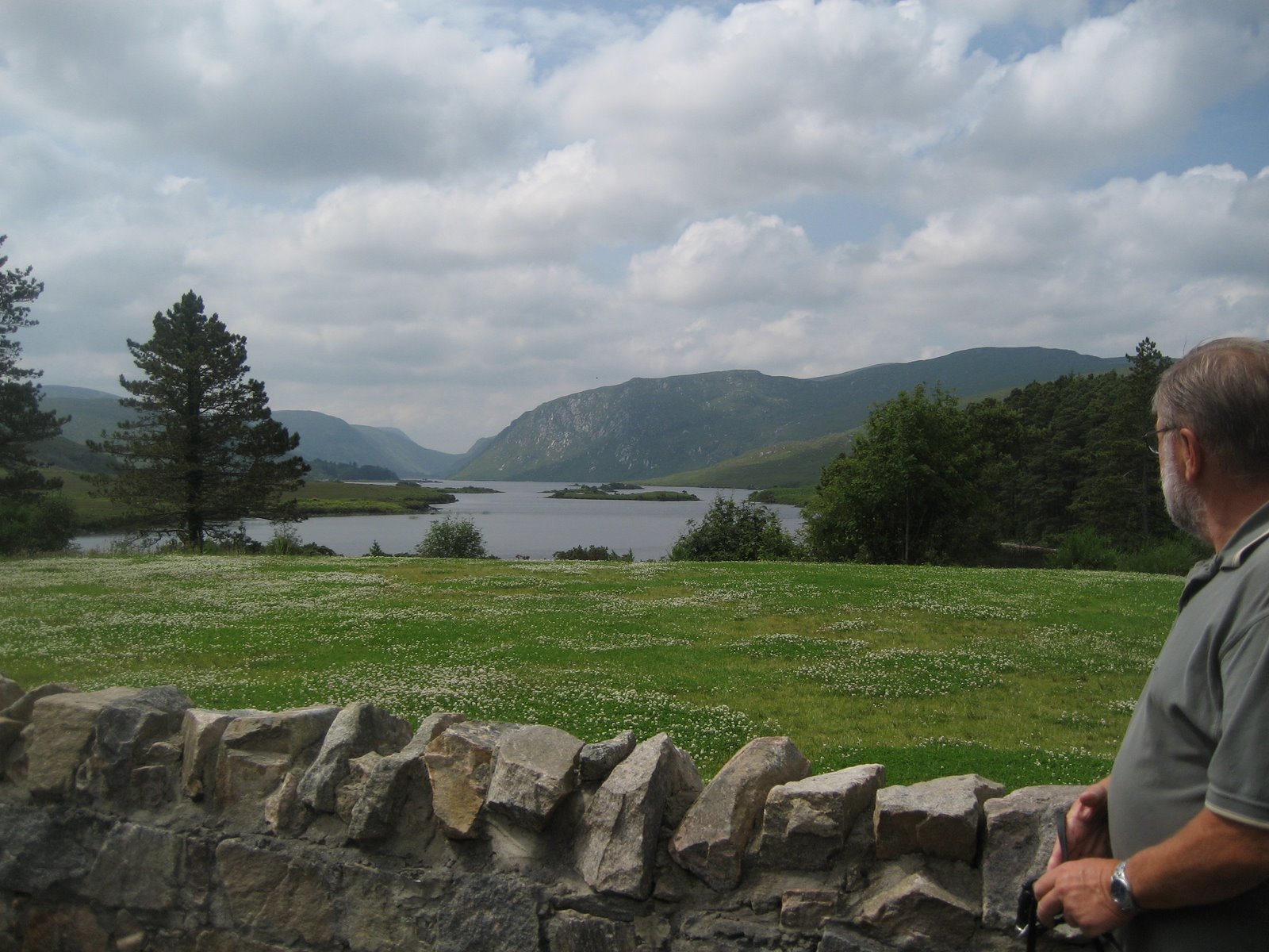 r store «Holiday Villages» hvor prisen for en «hytte» ligger på rundt 2,5 mill. Omtrent som Voss og Geilo mener vi. Det er masse nybygg overalt, store hoteller og mange golfbaner. Tydelig et ferieområde. Virker som mange av «hyttene» er usolgt. Ellers er området vi er i det området av Irland hvor de snakker/bruker gælisk. Alle skiltene er på engelsk/gælisk og av og til har noen entusiaster sprayet over den engelske teksten så da er det bra vi har den hyggelige damen som forteller oss hvor vi skal dra. Ikke at hun er til å stole på, hun har ledet oss på ville veier noen ganger, eller skal vi heller si trange veier………… så vi har funnet ut at vi også må bruke gamlemetoden med at mor leser kartet. Så nå har Ray en tytakjerring på hver side av seg som dirigerer……… og i dag kjører vi til Glenveagh nasjonalpark. Nydelig sted hvor der også er et lite slott. Fra parkeringen er det 4 km å gå til slottet, der er en liten shuttle buss men der er ikk