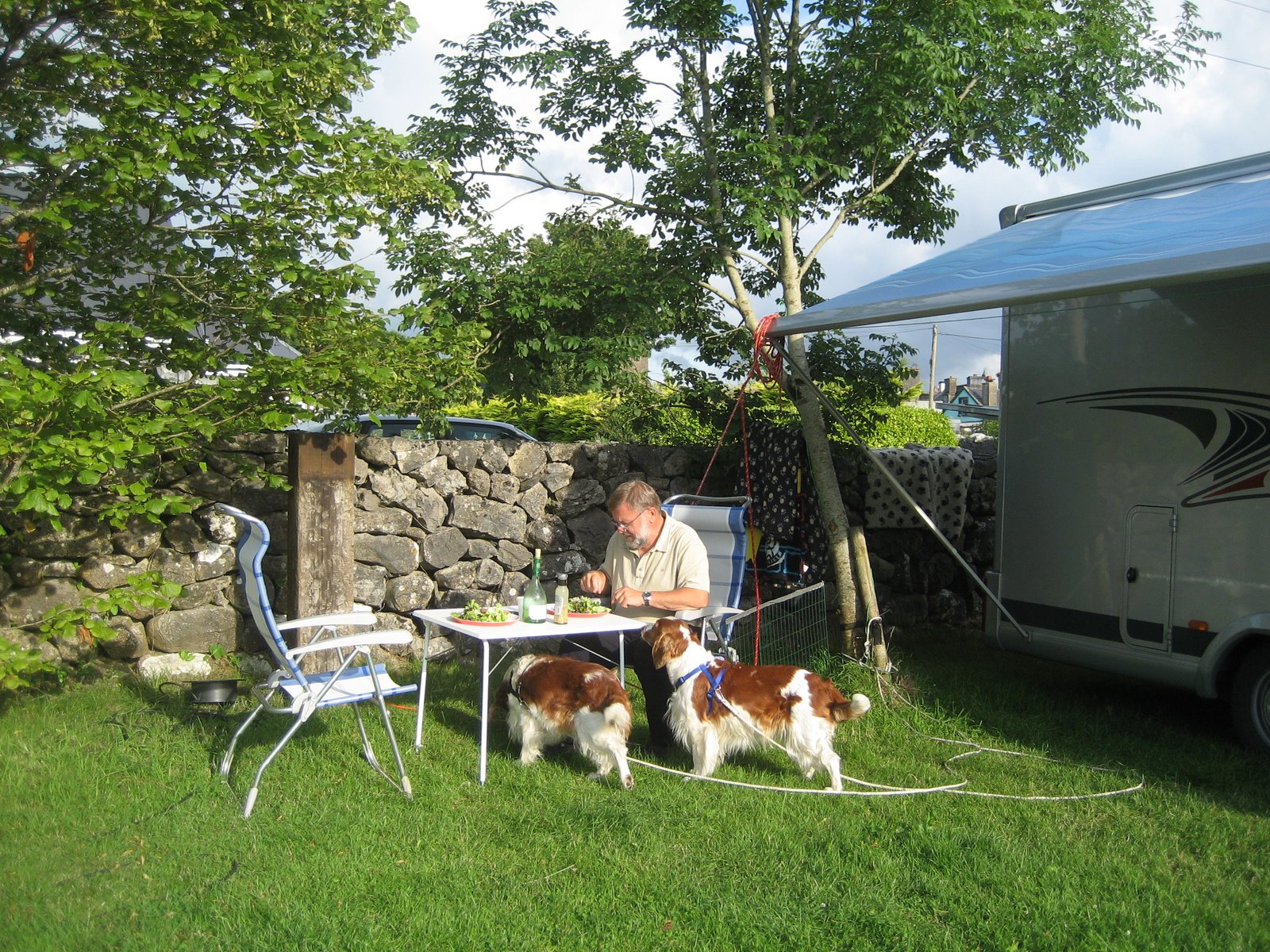 I går kveld så vi en butikk her i Galway for vår internettleverandør – så vi bestemmer oss for å dra inn og klage på hvorfor vi ikke kommer på nettet. Riktig trivelig her i sentrum, mange små butikker og vi er selvfølgelig på cafè og får oss en dobbel cappuchino. I mobil-butikken sier de at avtalen mellom Irland og UK er kansellert derfor får vi ikke tilgang til serveren her i Irland. Så vet vi det. Og så drar vi videre. Vi drar mot landskapsområdet som heter Burren og her er veiene helt utrolig. Den er så smal og svingete av vi kjører i 20-30 km i timen og det går opp og ned som i en berg og dal bane. Et morsomt innslag underveis var en sauebonde som jaget sauene fra bilen ved hjelp av en stokk og en lettere stresset collie. Men det gikk jo fint, og vi hadde jo god tid å henge bak. Kommer så til landsbyen Corofin og her er en campingplass midt i hjertet av den lille landsbyen, som ser ut som den har flere pub’er enn vanlige hus. Tror vi talte 6 puber, 2 restauranter og 2 matbutikker. Og det virker ikke som om det er særlig «turist» rettet, ser ut som det mest er «vanlig» folk her. Campingplassen er kombinert med et ungdomsherberge og her er det en ungdomsskole klasse på tur så det er jo litt livlig til tider – men nå skal vi ikke være sur og grinete. Internett har de også – nå har vi ingenting å klage over. Pent vær og internett. Har deilig middag og en iskald hvit Chenet. Bikkjene får middag og griseøre, alt er idyll. Så treffer vi igjen et dansk ektepar på sykkeltur som vi hadde observert på campingplassen i Galway. De forlot Galway i dag morges og hadde da altså syklet samme distansen som vi hadde kjørt ! 59 år gammel var de og……….. Og dette er ikke panne-kake-land akkurat. Vi får helt dårlig samvittighet og bestemmer oss for lang tur med bikkjene i morgen, ned til en liten innsjø. Turen skal være merket og vi har fått beskrivelse i resepsjonen. Danskene anbefaler at vi må dra opp til kysten til et sted som heter Cliffs of Moher, der skal det være fantastisk natur. Men vi orker ikke mer svingete landeveier og berg og dal bane – det får sykkelturistene ha i fred for denne gangen.