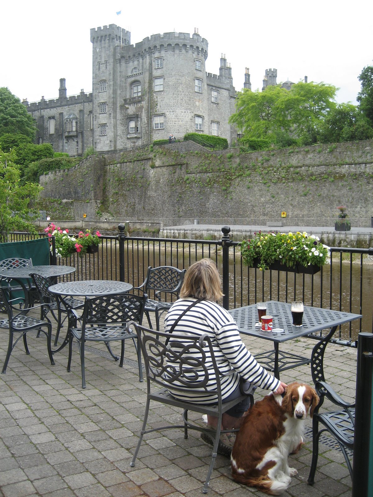 norske bobil – et ektepar fra trøndelag med 3 dvergschnauzere ! Ikke bare oss som svirrer rundt med hunder tydeligvis ! Vi går tur med hundene inn til byen, rundt Kilkenny Castle er det en stor park men her må hundene dessverre være i bånd. Vi blir tørst og forsøker oss på en pub men der får vi ikke komme inn med hunder. Vi finner heldigvis et hotell med ute-terrasse og kan ta oss en øl der – Guiness på Ray selvfølgelig ! Mona hadde håpet på et glass Kilkenny, men det har de ikke så det blir Heineken i stedet – kan du tenke