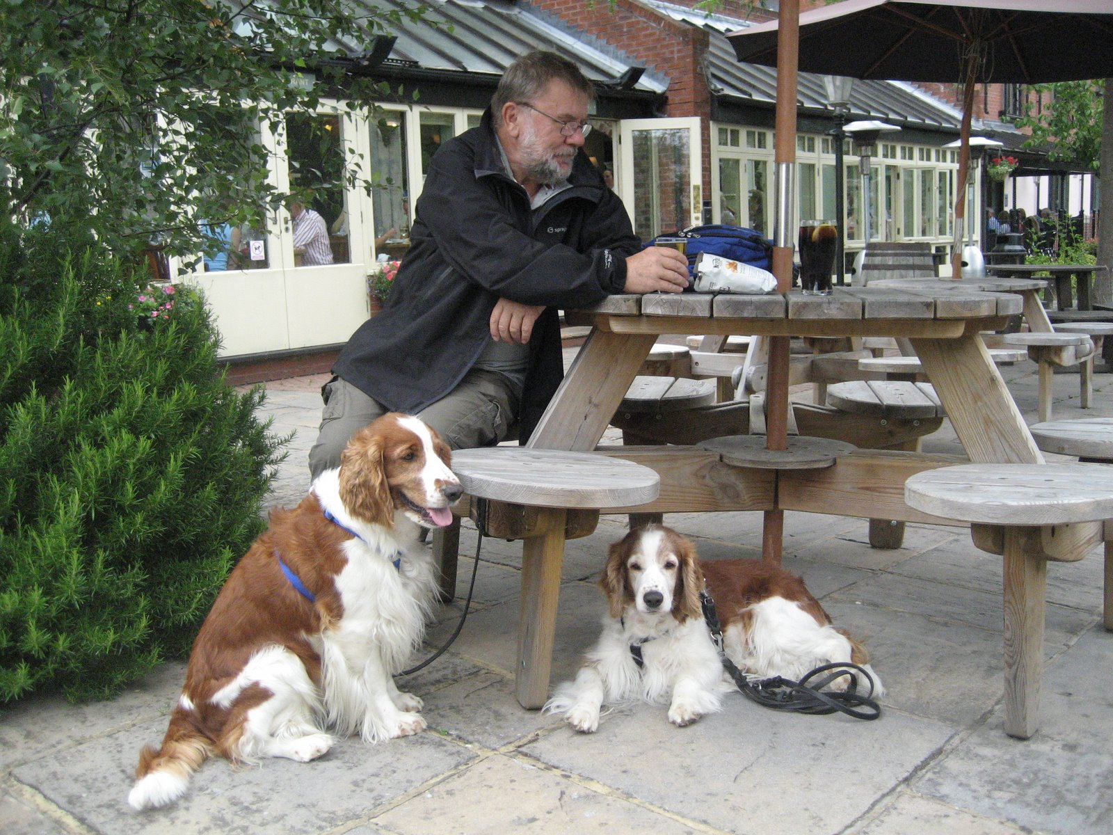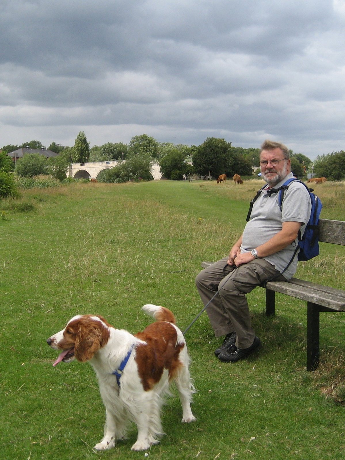 Koste oss på campingplassen i dag, gikk tur langs elven, glass øl på puben, kjøpte søndagsaviser og dormet oss. Vanskelig å gå tur med hundene her på campingplassen, her er fullt av kaniner, Pegi har ikke tid til å tisse en gang når hun kommer ut. Så vi må gå ut på gaten og et par minutters gange ned til elven og så gå tur der i stedet, der er det ingen kaniner, bare gjess og ender og sist gang vi var her var der hester som gresset, denne gangen var det en flokk med kviger. Vi har heldigvis internett her så vi fikk surfet på gule sider og har funnet et diesel-verksted i Egham, ca. 10 minutter å kjøre. Håper de kan ta oss