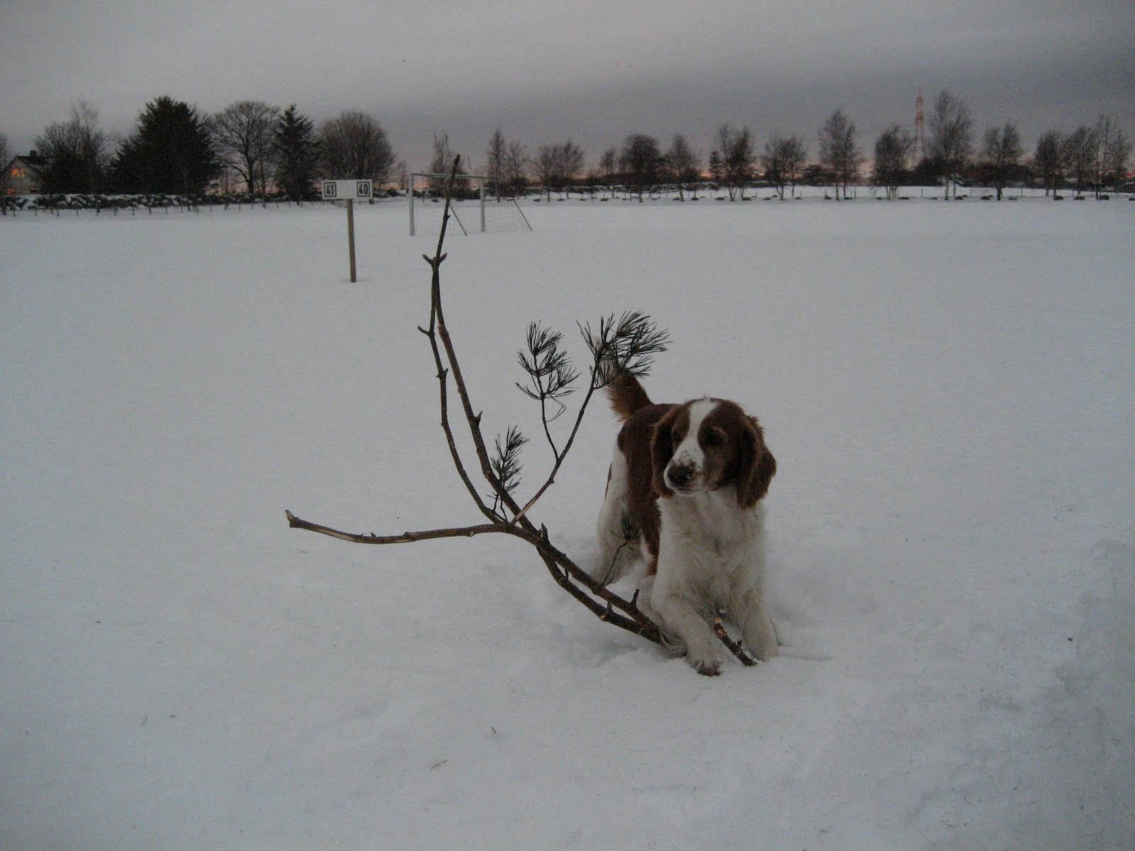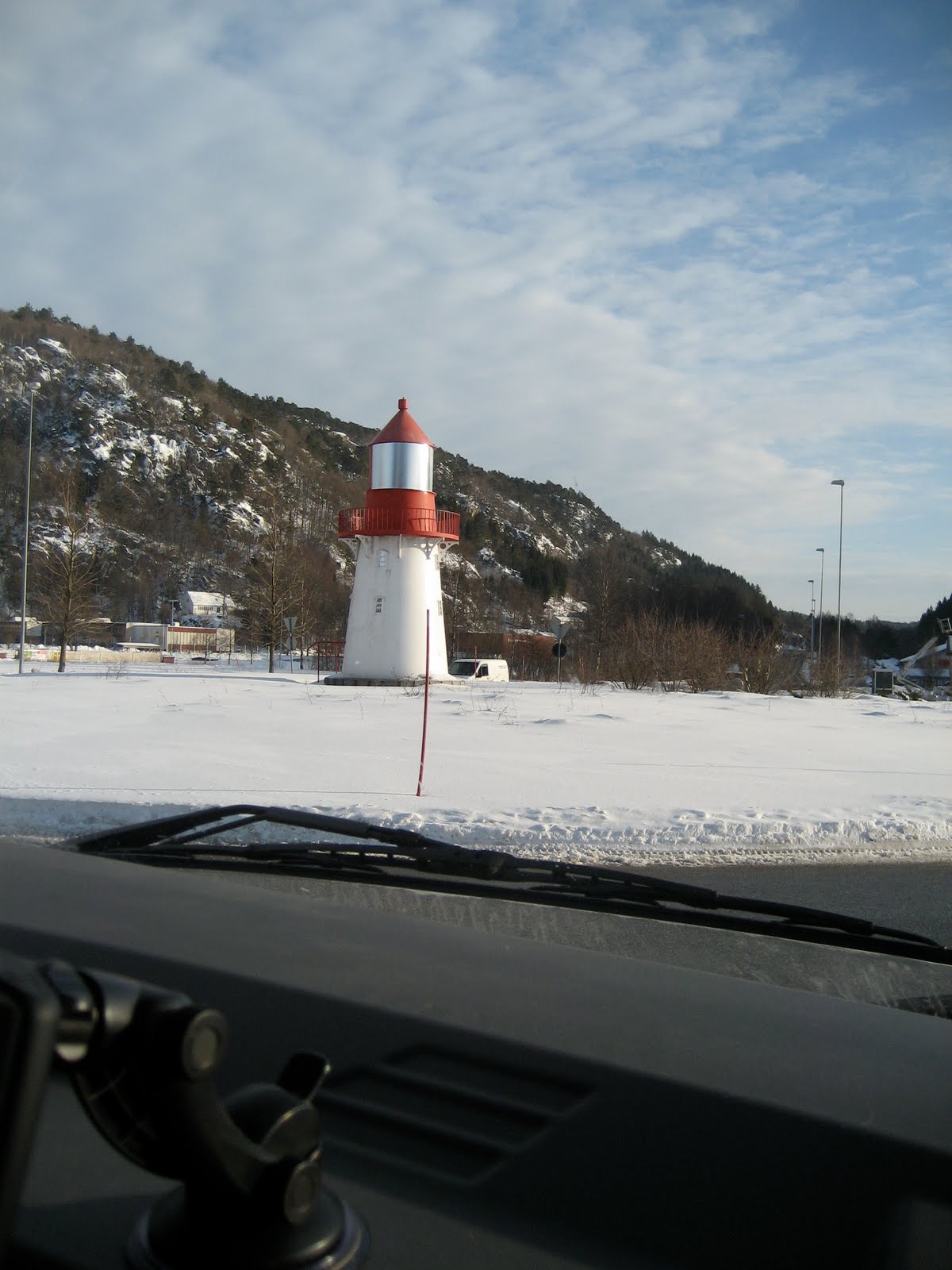 Våkner til is på innsiden av frontrutene, men vi har hatt det godt og varmt i sovedelen av vognen. På radioen hører vi at det er minus 5 i Stavanger. Spiser frokost og lufter hundene på fotballbanen, de får løpe løs det er ingen andre her. Pegi finner restene av et juletre som hun løper rundt med og har det moro med. Kjører så avgårde i strålende sol, solen er så lavt på himmelen at den skinner rett inn i lugaren til småpikene som er nesten på gulvnivå. Det er rene påskestemningen på veien, sol og sne. Kombinert med atskillig fler tunneller enn vi ante på denne strekningen blir det en del banning når vi stuper inn i tunnellene med solbriller på. Passerer Lindesnes hvor det står fyrtårn i rundkjøring
