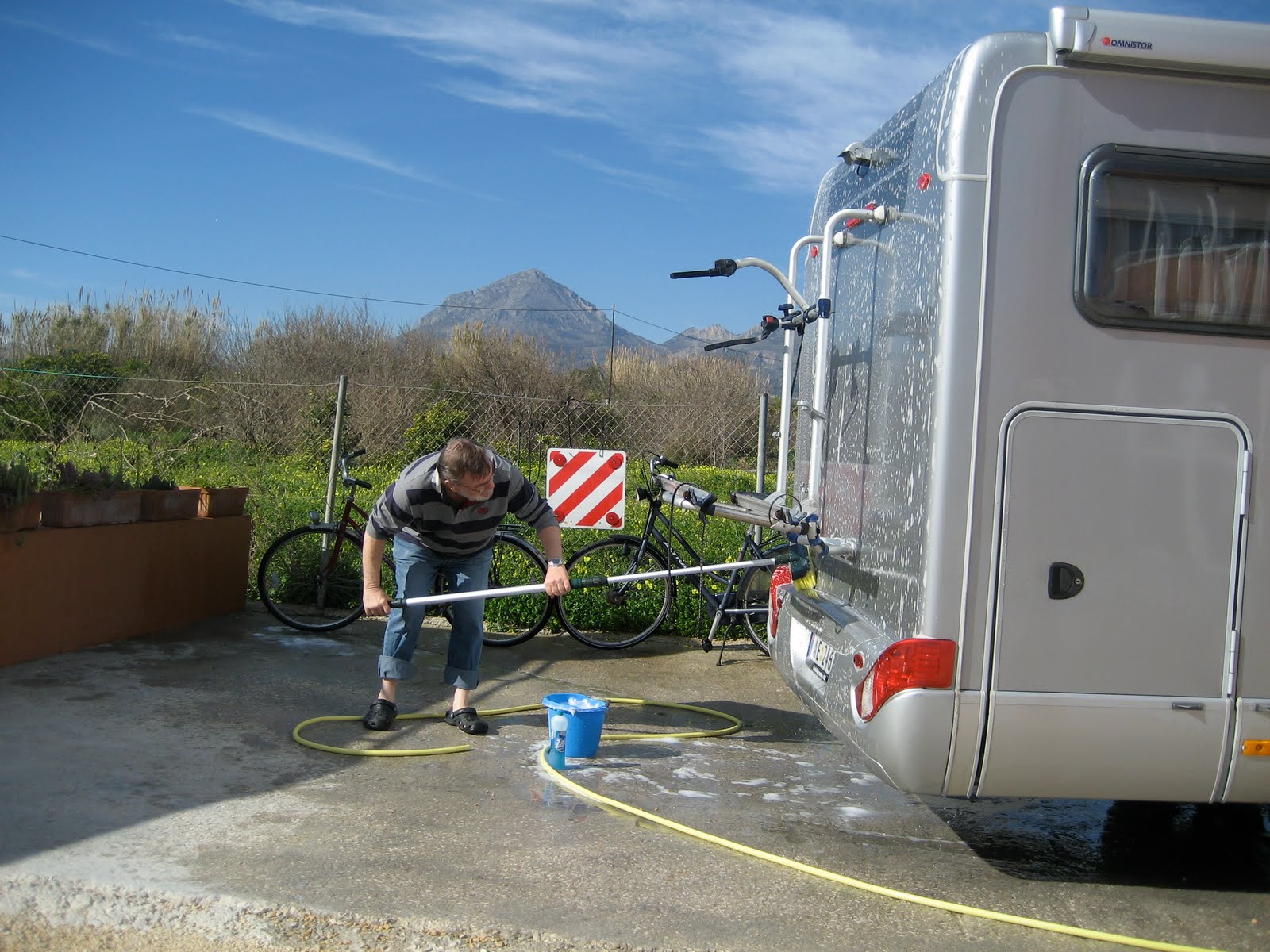 Våkner opp til deilig sol men da vi går morgentur med hundene ser vi at det er rim på marken. Kjempefin bobil plass her, til og med plass for vasking av bil så her får vi endelig vasket Dorris og syklene – de ser ikke ut etter gjennomfarten. Vi sitter i solen og prater med naboene, de er fra henholdsvis Belgia og Tromsø. Vi visste først ikke at han var norsk for han har en tyskregistrert svær Concorde, det er en bil som han hadde kjøpt i Tyskland og som ikke skal til Norge. Det er en del som gjør det, det er forhandlere i Tyskland som oppbevarer bilen for deg når du er hjemme i Norge. Mye av dagen går med til å forsøke å få liv i parabolen men det kommer ingen signaler, vi er antageligvis for langt syd. Det er deilig i solen, må sitte litt i skyggen så vi ikke blir brent, det er som i påsken, varm foran og kald bak. Så spaserer vi ned til byen, ca. et kvarter, og ender opp med å handle på Lidl av alle steder. Det blir innekveld med Quiche Lorraine og Cabernet Sauvignon fra Flensburg. Ellers er klientellet her for det meste fra Nederland og Belgia, med noen tyskere og briter innimellom.