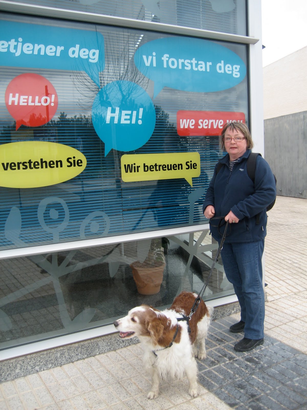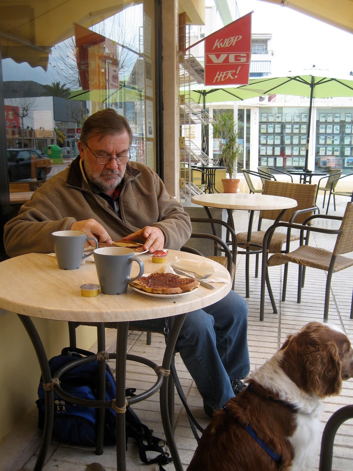 Det ble litt gråvær i dag, det var meldt så det var ingen overraskelse. Tilbringer mesteparten av dagen med å surfe og forsøke å få parabolen til å virke men gir opp for godt på den fronten. Vi trenger en del småting og tar hundene med og går ned til byen. Her går vi forbi bank med norsktalende betjening, norsk legesenter og ender opp på norsk kafè der vi har cappuchino og vafler ! Her har de VG og Se og Hør. Ser litt i vinduene hos eiendomsmeglerne uten at det frister det minste med å kjøpe pensjonistbolig her. Ville nok ønsket oss noe mer idyllisk og pittoresk ja.