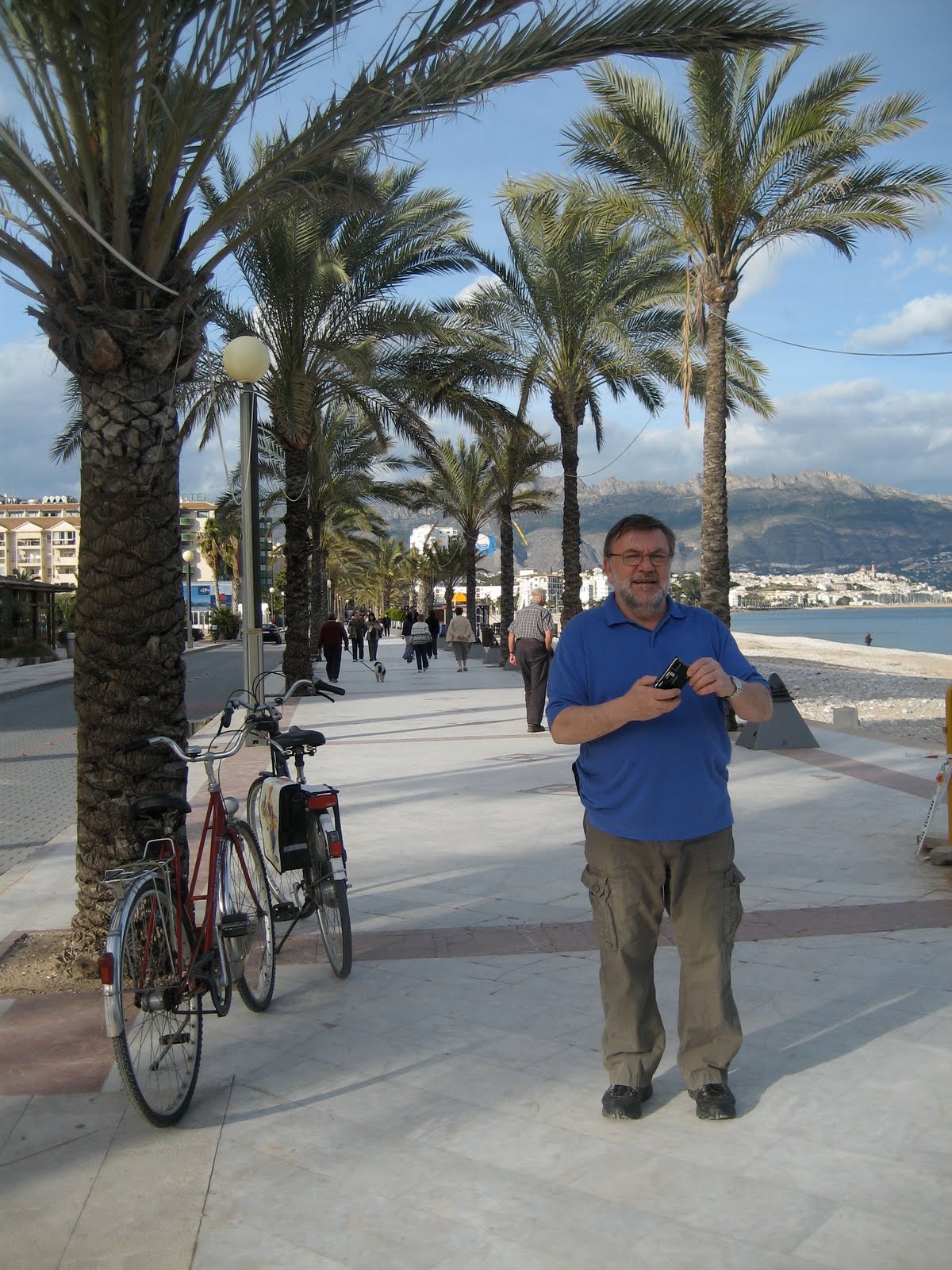 i Albir for å handle til helgen, så mye vi klarer å få i sykkelvesken i alle fall. Veldig flott butikk, alt er så delikat og fantastisk utvalg i kjøtt og fisk. Utenfor treffer vi på en kar som venter på konen inni butikken. Han har 2 flotte cavalerer i sykkelkurvene. Sånn kunne vi også gjort hadde vi hatt små hunder. Som det er nå ligger de hjemme og purker i bobilen. Vi har alle 3 taklukene åpne og persiennene trukket for så vi håper det ikke blir for varmt, men du er alltid litt urolig på varme dager. I går hadde de det i alle fall luftig da vi var ute for da glemte vi å stenge den lille garasjedøren så dyrene hadde full oversikt over campingen da vi var ute. Vi turde ikke spørre naboen om der hadde vært noe boffing. Naboen fra Belgia har selv to Yorkshire terriere som ikke er spesielt stille av seg.