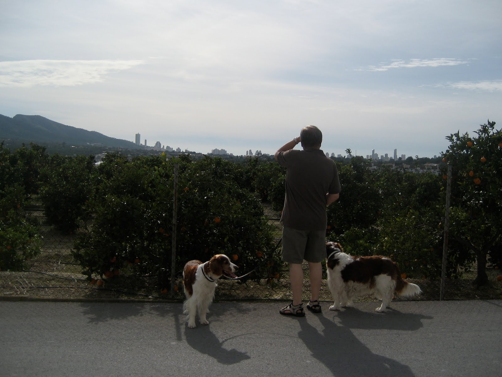 Ellers som bildene viser er våren på gang, mandeltrærne blomstrer og sitronene utenfor gjerdet er det lov å plukke er det ikke ? På bildet av Ray og hundene er det høyblokkene i Benidorm vi ser i bakgrunnen.