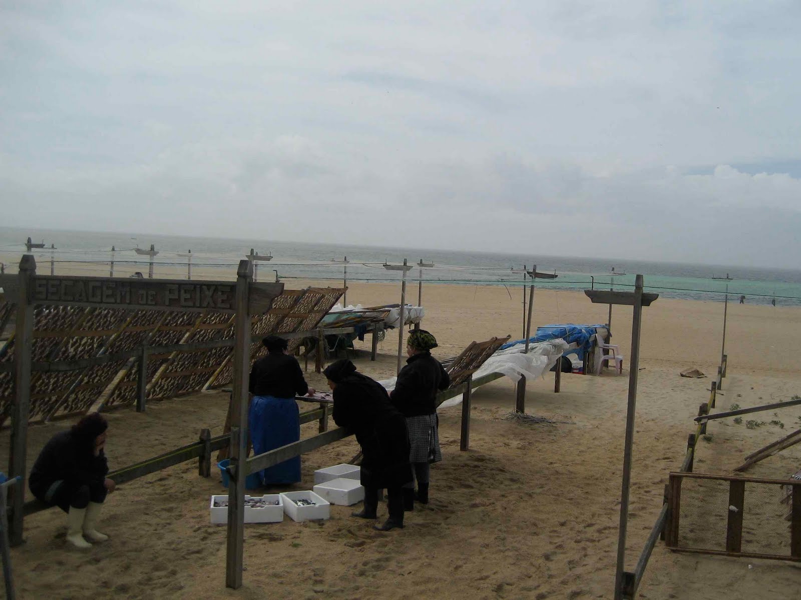 Det er lørdag og vi MÅ ut og bunkre. Tar bilen til nærmeste super marked som er et Modelo, og de er veldig fin, kan omtrent ikke tenke en ting de IKKE har. Kjører så ned til Nazarè og lar hundene få løpe på den fine stranden og kose seg. Det er flotte bølger som slår inn og Pegi koser seg med å jage måser. Det er en blanding av sand og grus. Grusen er så flott at den fortjener et bilde. Skulle ønske vi kunne ha slik grus hjemme i hagen, ser ut som rene smykke – stener. Vi kjøper litt presanger i turist butikkene langs promenaden, mye strikketing. Ellers tørker de små fisk i nett på stranden som de selger og spiser som snacks (tror vi) . Vi er pysete og holder oss til kaffe og is ! Mange gamle kvinner går i tradisjonelle gammeldagse klær.