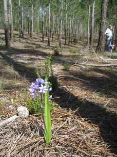 Som belønning fikk de flott søndagstur i furu skogen som er rett over veien fra camping – plassen. Flott og tørr tur, fine gule busker, søte små blå blomster og noen små gule blomster. Og vi hadde den endeløse skogen for oss selv, ingen portugisere på søndagstur her nei, selv om det er merkede løyper der. Vi kjenner igjen merkingen fra fotturer vi hadde i Bourgonne i Frankrike. Røde, gule og blå merker på trærne.