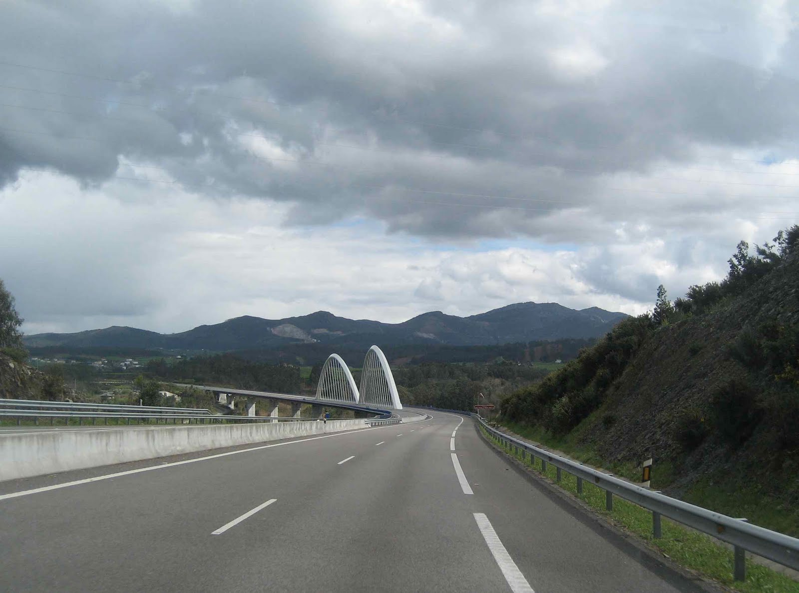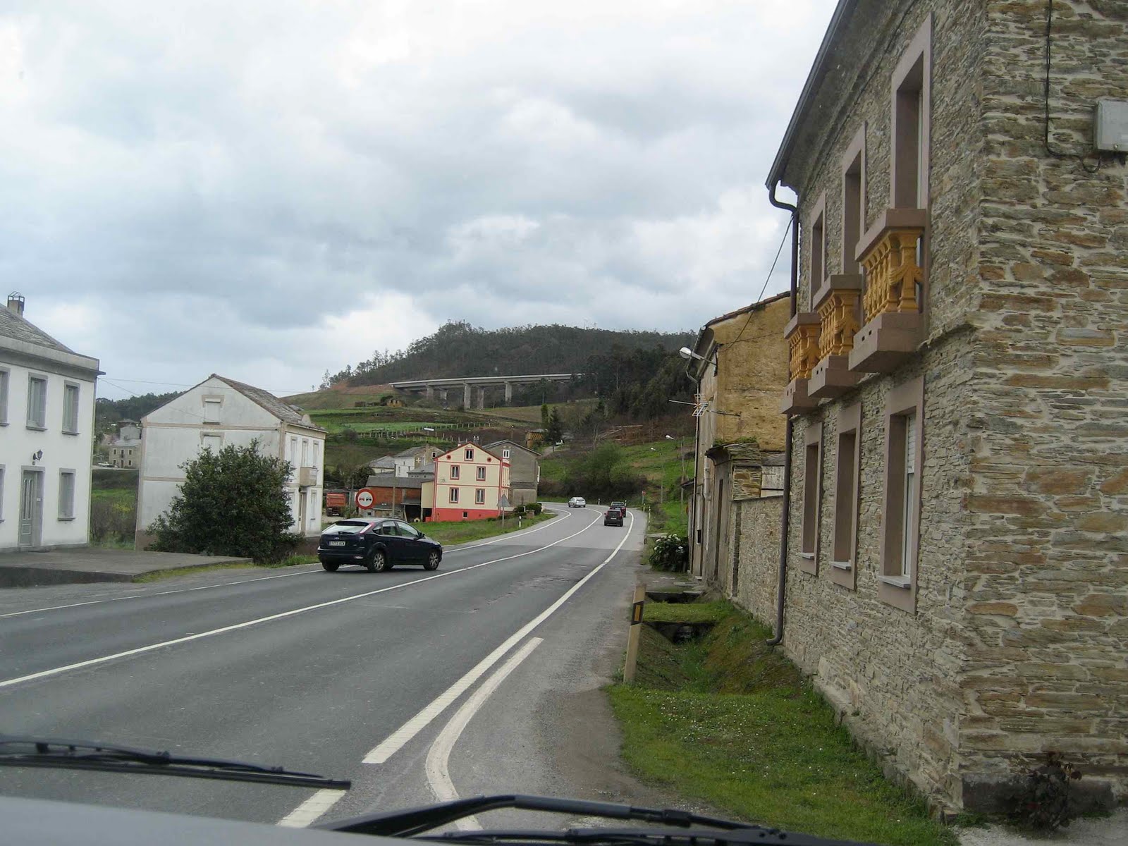 nærmer oss kysten er det fin ny motorvei. Det er fjell-landskap vi kjører gjennom, landskapet kunne vel vært hvor som helst i nord-europa. Det er hus av gråstein, sorte tak og sorte og hvite kuer som beiter. Det er også bjerketrær og her oppe på fjellet er ikke bladene kommet ut ennå, men når vi kommer ned til kysten er skogen grønn. Det er jo den grønne kysten.
