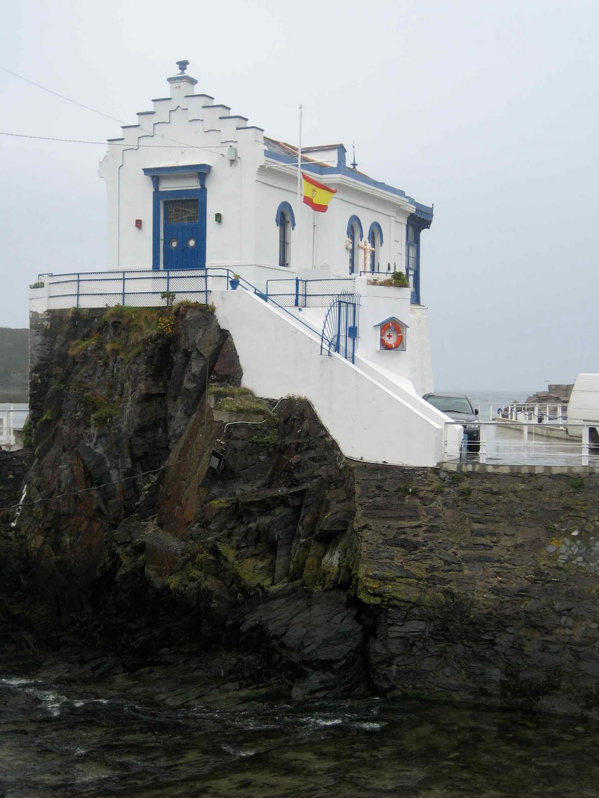 Så våkner vi til regn regn regn. Etter en meget sen frokost finner vi ut at vi MÅ nå ut med hundene så vi hyrer oss ut i full regnutstyr og tar en tur ned til byen. Vi hadde ventet oss at alt ville være dødt på en langfredag – men ble meget over – rasket. Byen er full av folk som myldrer (alle med paraply – ikke enkelt på smale fortau) små butikkene er åpne, det er et marked med hånd lagete ting, smykker og kurver og honning etc. og alle restau – rantene er fulle av folk som spiser lunch ! Vi har jo dyrene med så vi kan jo ikke gå inn noen steder, her er ingen uterestauranter, ikke at det hadde fristet i regnaveret uansett. Forsøker å ta noen bilder men er redd for at det skal komme vann i kameraet. Så etter å ha gått omkring en stund, sett på fiskebåtene i havnen, havnekontoret som flagger på halv stang fordi det er langfredag og de gamle husene rundt havnen bestemmer vi oss for å gå hjem. Byen rundt havnen minner oss meget om Brixham i England der vi bodde da vi var nygift. Så er det alle oppoverbakkene tilbake til campingen, og da er det at det skjer: Solen kommer frem og regntøyet er tørt og fint når vi kommer hjem. Hundene er fremdeles våte og må frotteres godt før de får komme inn. Vi orker ikke gå ned til byen en gang til i dag så vi blir værende på campingen.