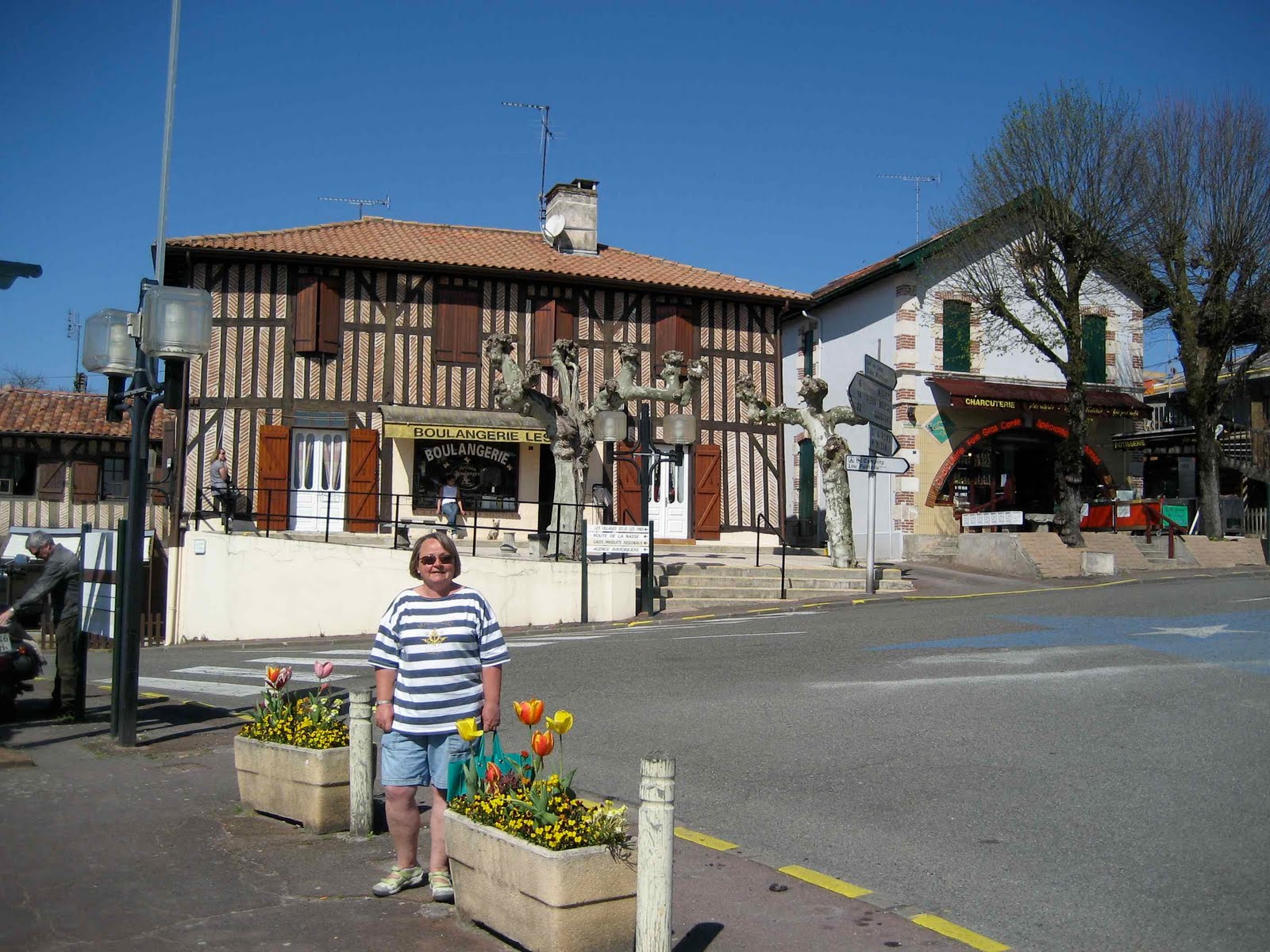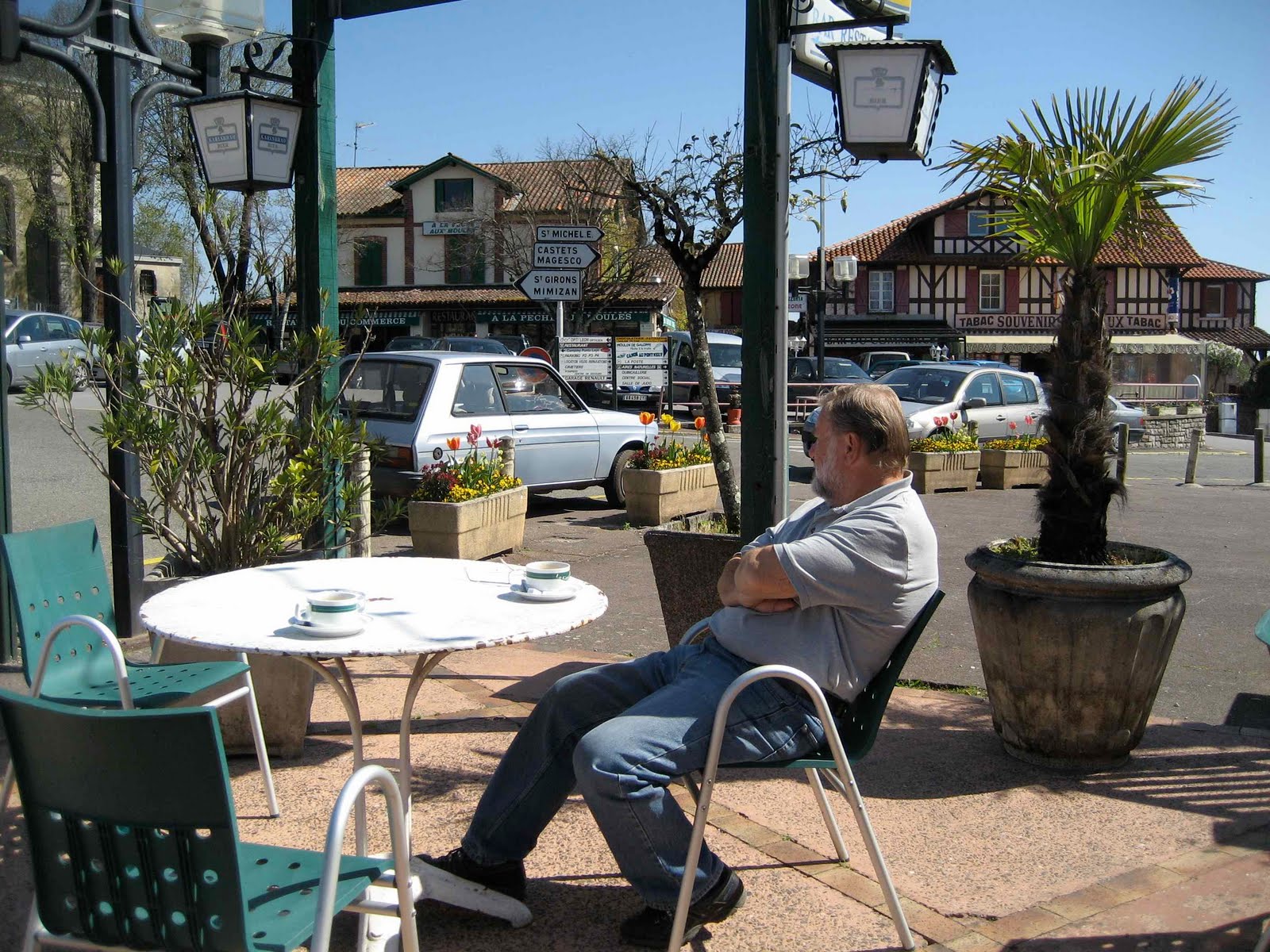 I dag sykler vi inn til landsbyen, det tar bare 5 min. Trenger litt fersk melk og har lyst å ta en titt på stedet. Og vi blir ikke skuffet. Leon er akkurat slik du hadde ventet å finne en liten landsby i Frankrike, med små butikker og kafèer – det er som du venter å finne René og Madame Edith når du går inn for å bestille kaffe. De har ikke cappuchino her ute på landet, men vi får det vi vil ha likevel: ”Deux cafès au lait s’il vous plaît”. Og nå har vi sluttet med tebrødene, et sted må grensen gå. Ellers er det deilig vær, soler oss og nyter livet.