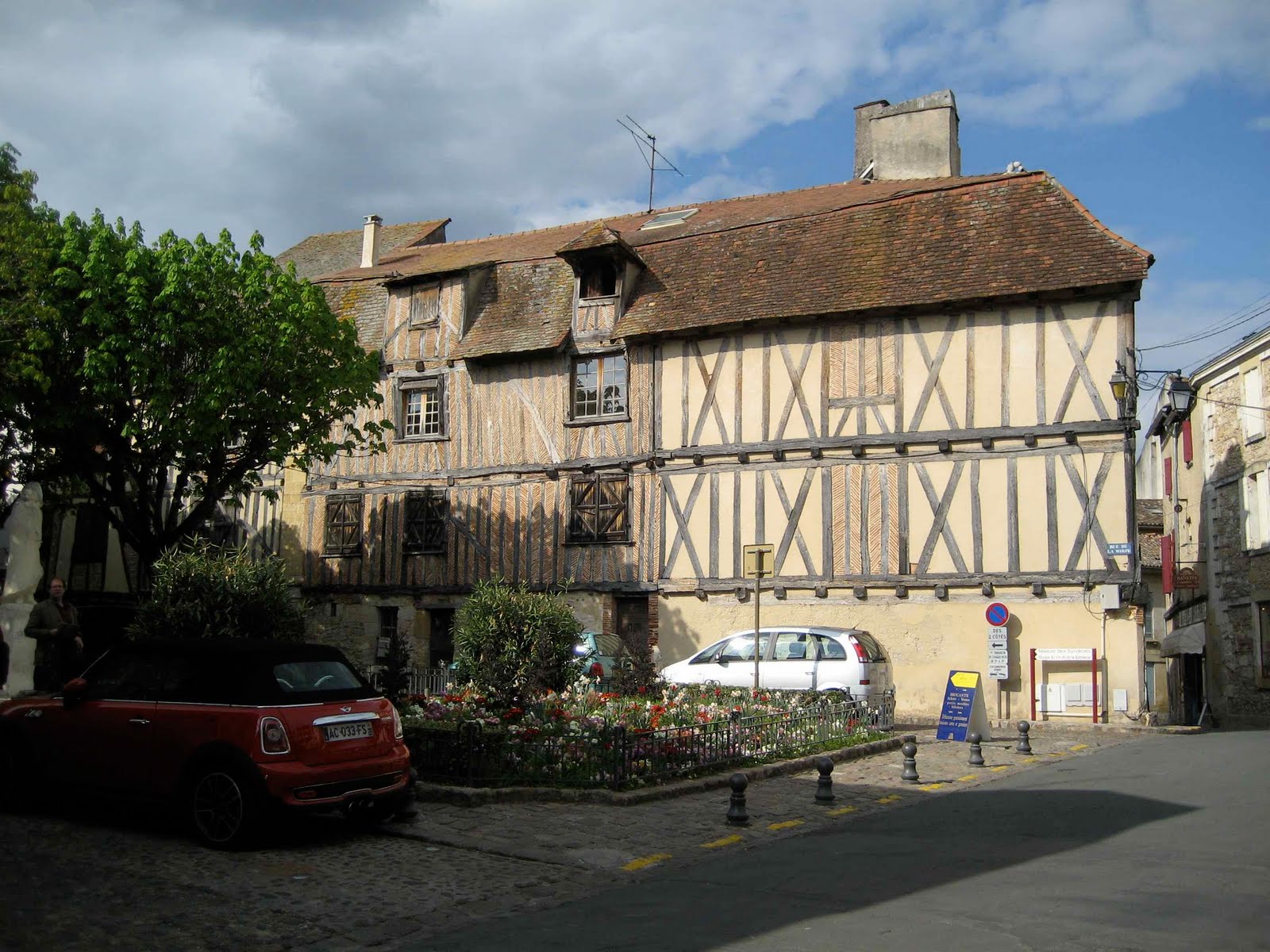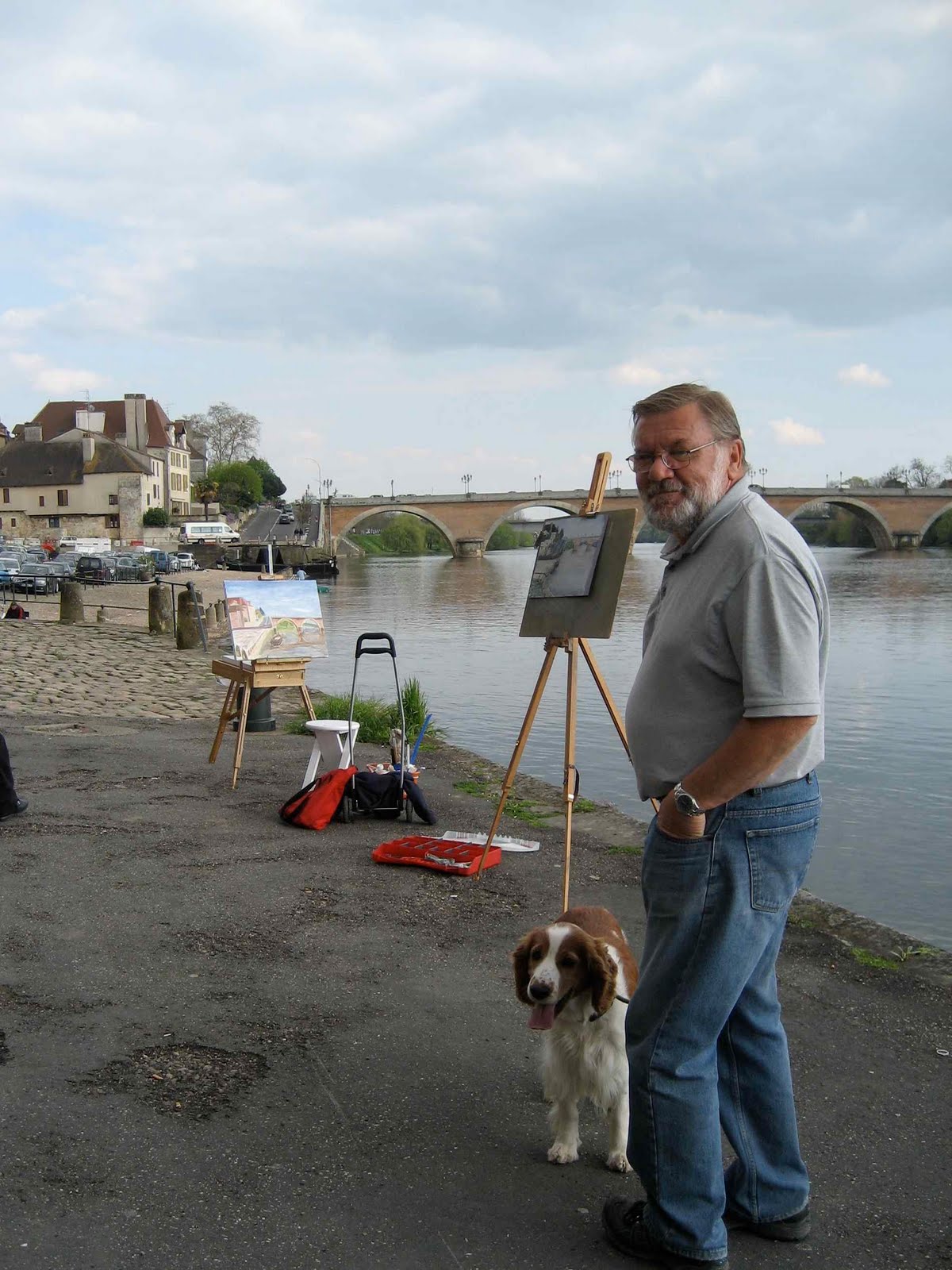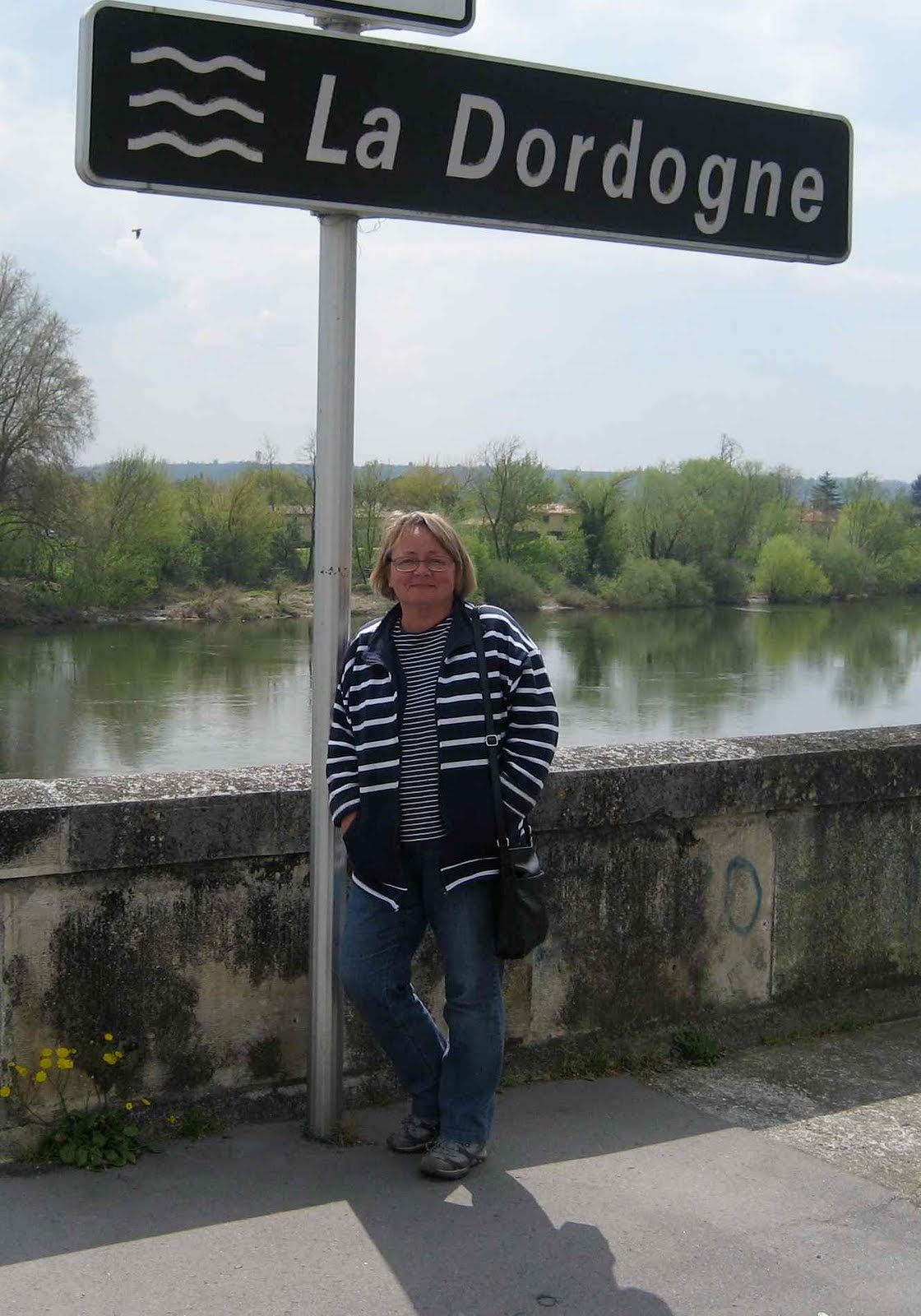har to bikkjer om bord. Etter morgenturen er de forferdelig møkkete og skoene våre ser ikke ut. Vi hadde tenkt å være her en dag til men finner ut at vi får komme oss til en by hvor forholdene er litt renere. Kikker innom et par landsbyer og ender opp i Bergerac, en sånn passelig størrelse liten by. Her er det 5 lovlige bobilparkeringer som er oppbrukt og så ca. en 10-15 plasser til som er like store hvor det står at det er forbudt for biler over 5m. Men det er god plass og her står en mengde franske bobiler så ”when in Rome”. Nydelig plass ved elven omtrent midt i byen – ikke rart den er populær. Gratis er det også. Går rundt i den gamle delen av sentrum, her står noen og maler broen – kanskje det er et berømt motiv ? Om kvelden går vi ut for å spise men restaurantene er ganske dyre – rundt €70 ville det komme på for oss to med en flaske vin, ikke rart de er omtrent tomme ! Så dumper vi borti en italiensk restaurant hvor vi omtrent får det siste bordet og her spiser vi deilig kalvekjøtt i gorgonzola saus for €12 hver ! Ikke rart her er fullt. Stor pizzameny har de også – og en av dem er pizza scandi- navia. Det er med rømme i tomatsausen og med røkelaks ! Noe å prøve når vi kommer hjem. Dette har vi aldri sett før. Mona er godt tett og snørret når vi kommer hjem, er begynt å spise pollenpiller, det er trær overalt.