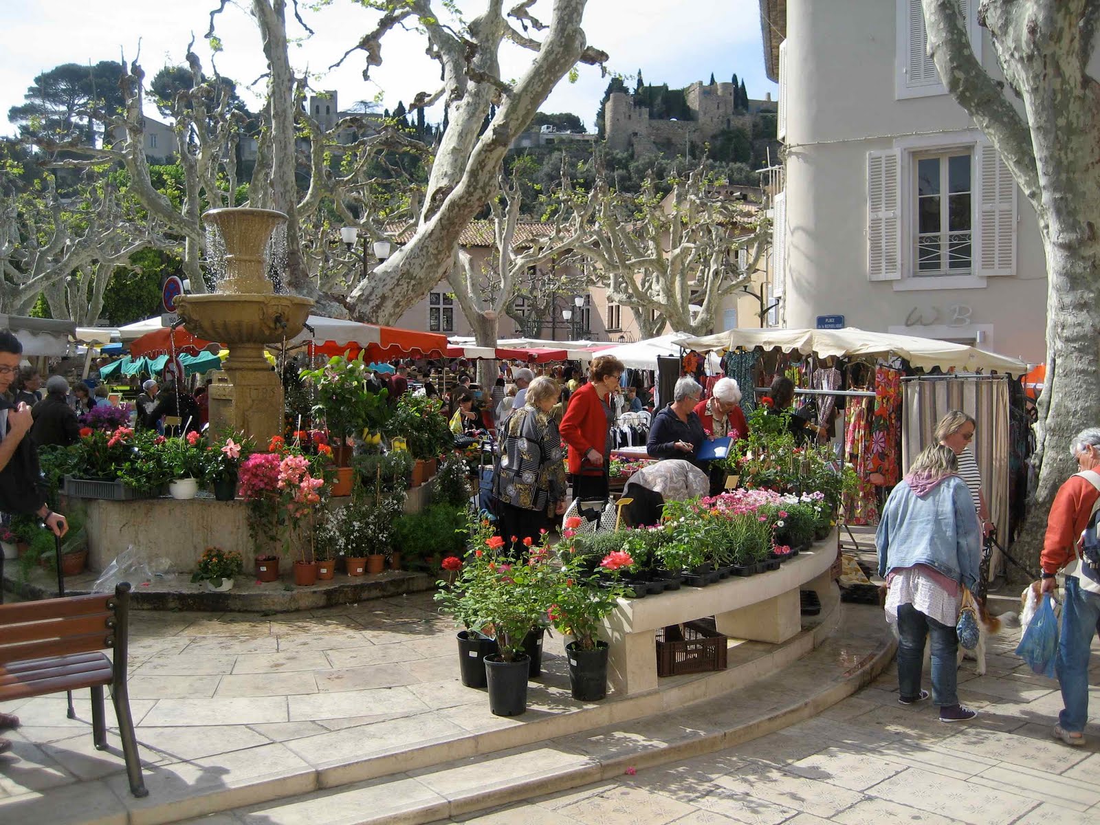 Det er marked i dag og hele byen myldrer. Vi snakker litt om hvordan det må se ut her i august når det er så fullt av folk her på en onsdag i april………….