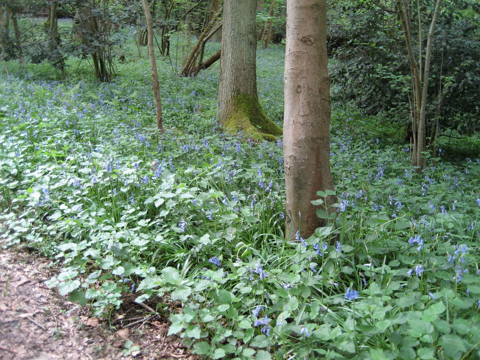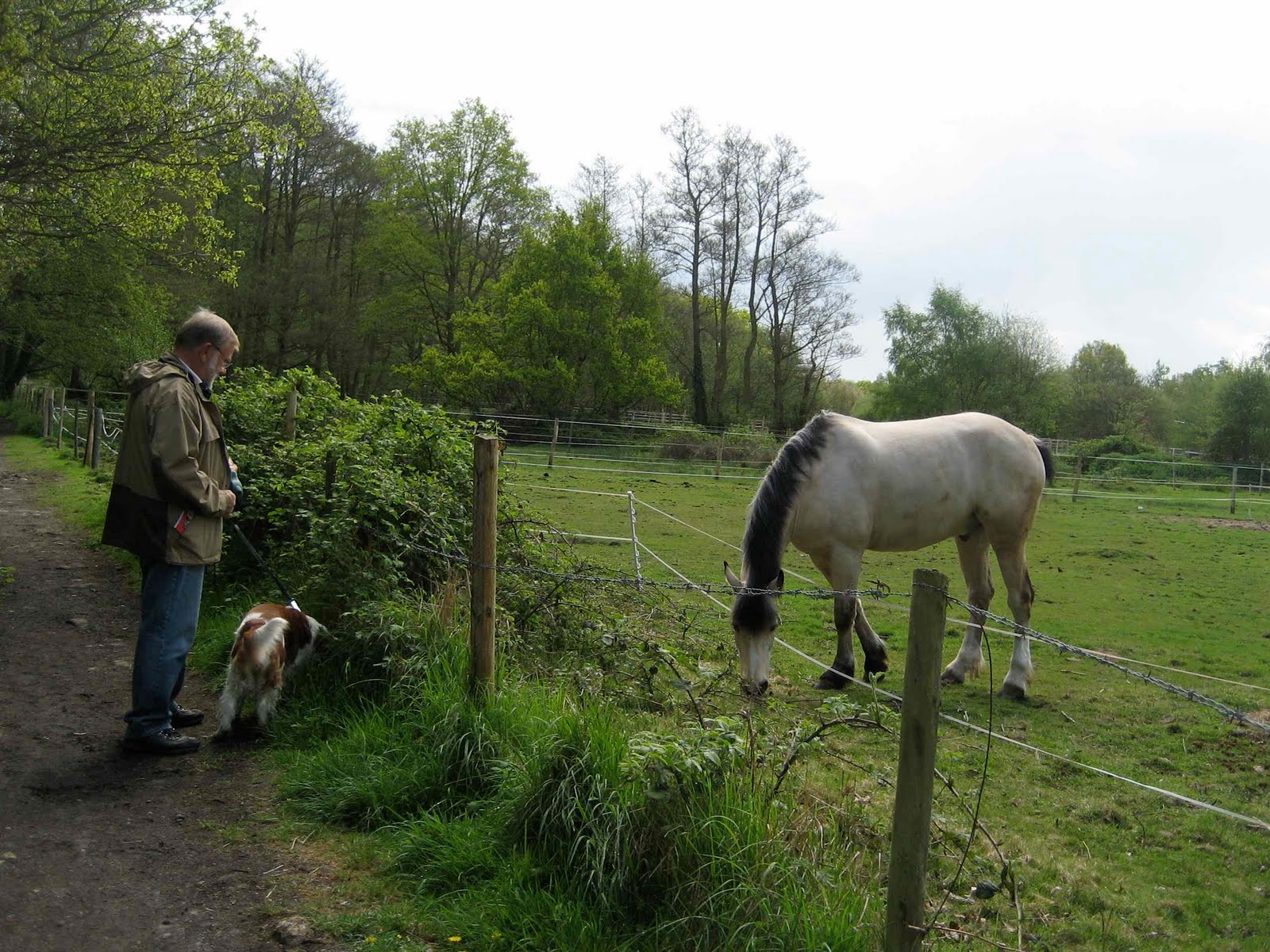 En av grunnene til at denne ble valgt er at der skal være en skog der som heter «Bluebell Wood» og akkurat nå er tiden for å se blåklokkene i blomst – og for det andre er Virginia Waters bare en 10 minutters kjøretur herfra. Så vi parkerte utenfor puben og startet ut på idylliske stier gjennom skogen og fant en del blåklokker men ikke så mange vi hadde håpet på. Kanskje det er et dårlig år for blåklokker, det har jo vært en usedvanlig kald vinter. Vi så to rever og noen kaniner, Pegi var helt i hundre, selv om vi hadde dem i bånd hele tiden, du vet jo aldri hva som er tillatt ute på landet, det var en del hester og kuer på markene. Det hadde regnet om natten og noen av stiene var veldig bløt og møkkete så hundene så ikke ut da vi kom tilbake til puben etter 3 timers tur.