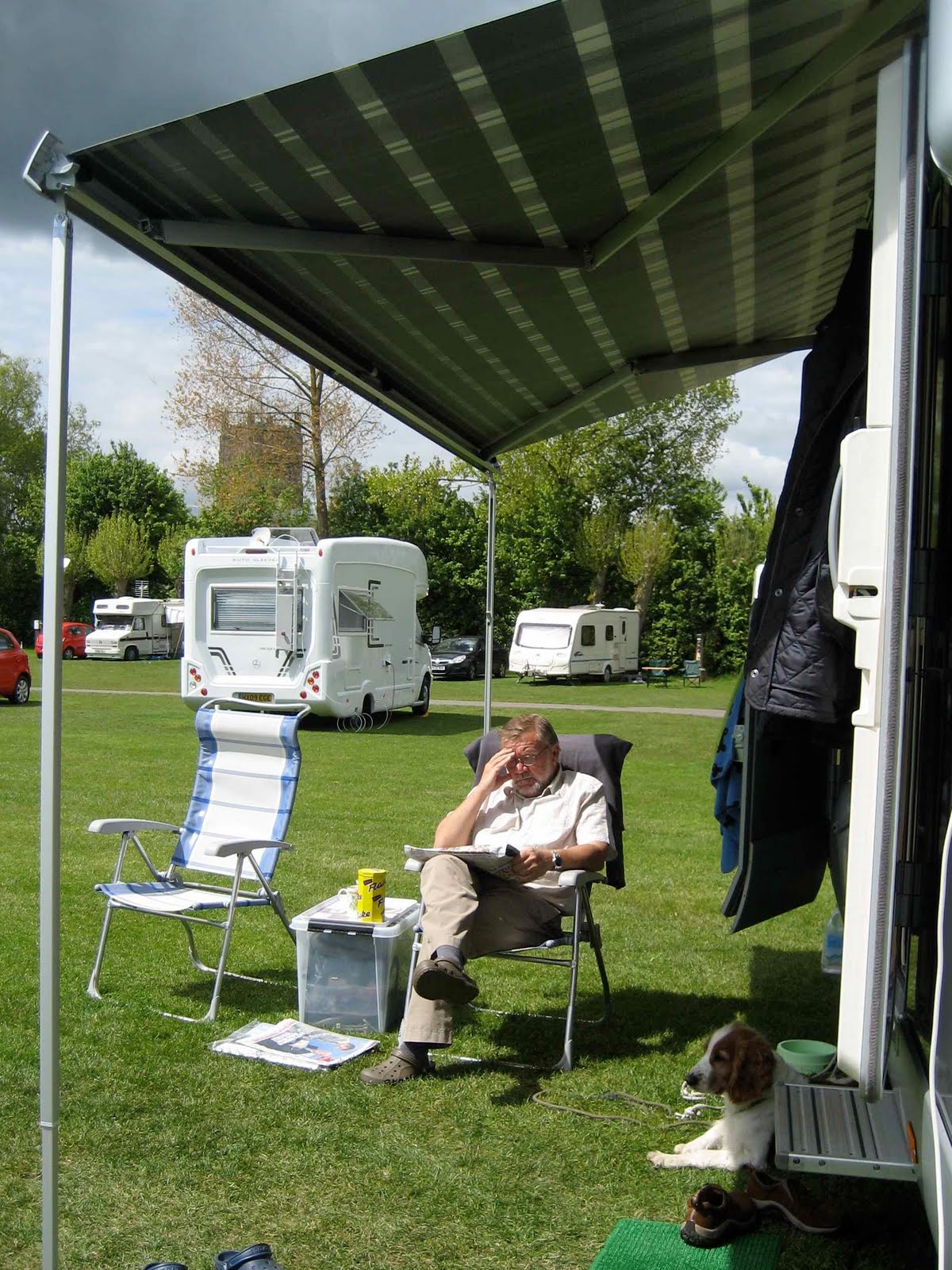 Vi er tydeligvis stadig tiltrukket av vann. Etter en lang søndagmorgen i sengen med te og TV (fordi det regnet ute) gikk vi i dag tur langs elven Avon som renner gjennom byen her. Også her fant vi et svært jorde som hundene kunne løpe på. Nå er de ordentlig bortskjemt med å få løpe løs på store idylliske marker. Så satt vi en stund ute med en kopp kaffe og leste engelske søndagsaviser men måtte trekke inn til slutt, det ble kaldt. Dette er foreløpig den kaldeste mai på 10 år sier de på TV. Det er selvfølgelig fordi vi er her. Langtids værmelding melder om 20 grader og mer neste helg – men da er vi på vei hjem – det er vel derfor !
