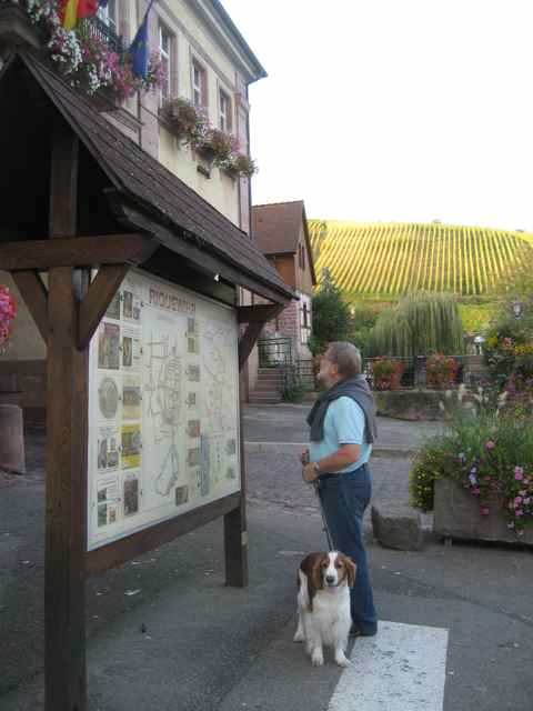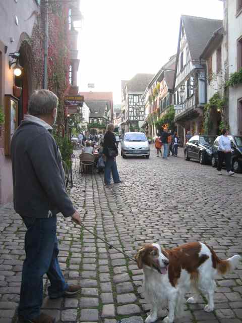 Går tur med hundene og tar byen i øyesyn. Skal visst være den mest pittoreske landsbyen i Alsacre. Og vakkert er det , blomster alle veier – hvordan de får til slike kjempesvære hengekurver begriper jeg ikke. Her er flere store vinhus og de holder øyensynlig på å gjære årets høst for hele byen stanker av gjærende druer – det er ganske gjennomtrengende. Restaurantene reklamerer med Vin Noveau – men det får nå være grenser på ferskhet ! Dette er en turistby og menyene ligger på 20-30 euro som er litt dyrt synes vi – og med fersk vin !!!!! i tillegg frister det definitivt ikke. Den i går var gale nok. Så vi koser oss i vognen med Falukorv og speilegg med Sørafrikansk rødvin. Vi fniser litt og morer oss over å sitte i gourmet distriktet Alsacre og spise svensk pølse med speilegg. Snakk om harry-bobilturister !
