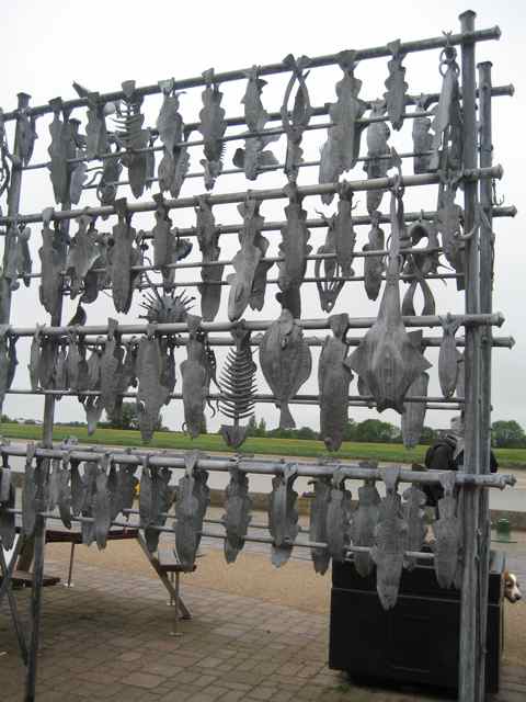 Så går vi litt rundt i Kings Lynn. Nede ved elven kommer vi over et sted hvor det er et ”minnes merke” ? eller kunst ? Det er i alle fall en masse tørrfisk som henger til tørk på stativ, laget i aluminium eller noe. Kanskje det har noe å gjøre med at Kings Lynn er en Hansa stad ?