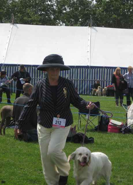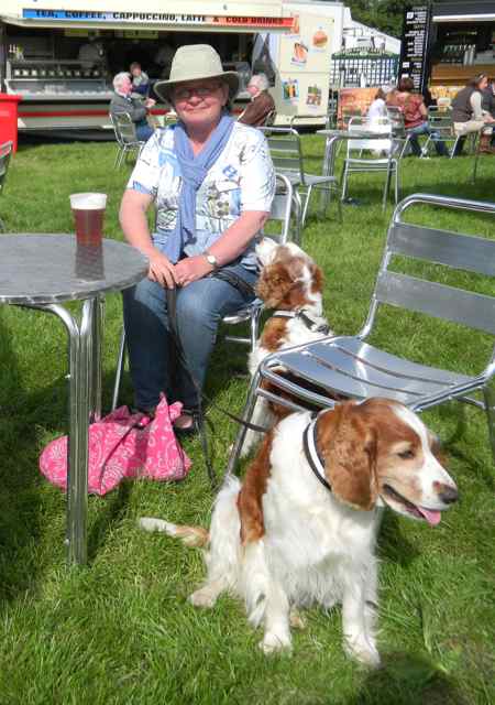 Vi lar foreløpig hundene bli igjen i vognen. Her er mange aktiviteter i dag, bl.a. hundeutstilling for Gundogs og Terriers. Vet ikke riktig hvilket nivå denne hundeutstillingen er på men det er en 12-15 welsher med – av varierende kvalitet. Og nytt for oss: tisper og hannhunder blir dømt samtidig i ringen.