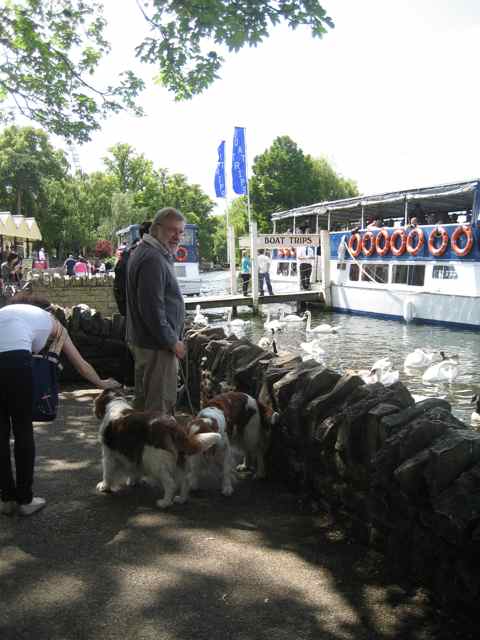 Så vi hadde ventet å finne et folketomt Windsor, men den gang ei. Det var fullt av både lokalbefolkning og turister, det var omtrent som søttende mai på festplassen, du gikk i kø. Vi trakket rundt i gatene en stund og fikk nå endelig kjøpt ”minnekrus” fra det kongelig bryllupet. Syntes vi måtte ha et ettersom vi har et fra bryllupet til Charles & Di i 1981. Så tok vi oss en tur ned til elven. Der var en del båter du kunne gå på sightseeing tur i, men vi ville ikke rekke tilbake før parkeringen gikk ut og dessuten hadde vel ikke hundene fått komme om bord uansett.