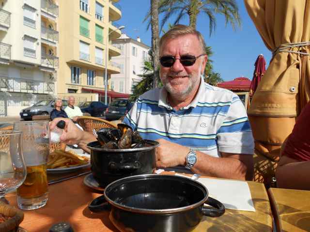 Selina måtte da ta til takke med en italiensk iskrem på strandkafèen på denne siden av grensen. Mona benyttet de omrokkerte planene til å gå til frisøren. Hadde gått forbi flere ganger – og lest reklamen i vinduet – Shampo-klipp-føhn €29 – så nå MÅTTE hun bare trå til. Det gikk helt greit, var såre fornøyd selv om betjeningen kun snakket fransk og italiensk. Om hverandre hørtes det ut som.Så var det igjen tid for mat – synes ikke vi har gjort annet siden Selina kom – greit å ha noen å skylde på – og denne gangen ville Ray ha Moules & Frites – blåskjell og chips – så vi fant en strandkafè som serverte det. Hadde tenkt å være litt slankende i dag men så fikk de noen fantastiske sitronpaier med marengs på servert ved nabobordet og dermed var løpet kjørt.