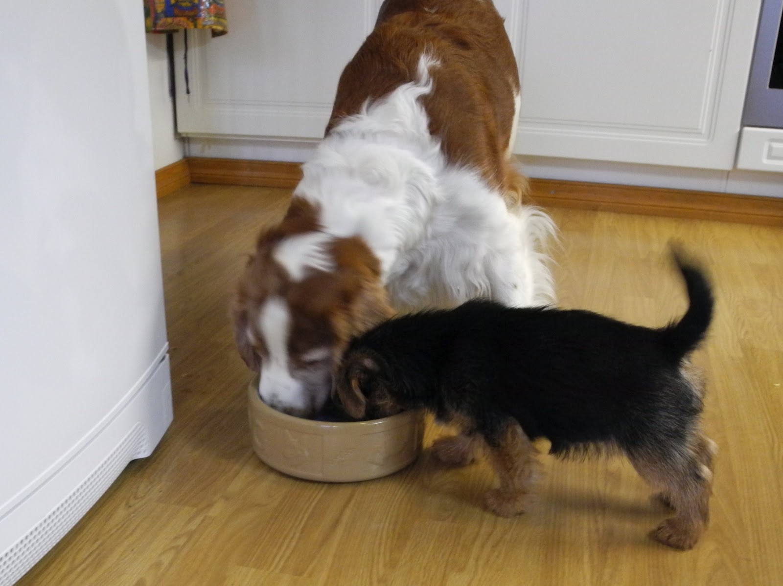 I følge oppdretter skal hun være veldig glad i å få yoghurt på maten, men det er ikke interessant i det hele tatt. Har de kanskje en annen type yoghurt i Sverige ? Vi kjører til butikken og kjøper kulturmelk, det har tidligere valper hos oss likt, men nei, ikke noe for Maggie det heller. I følge oppdretter er hun også glad i egg. Vi forsøker med rått egg, nei det var ikke det rette. Eggerøre da ? Nei ikke det heller. Vi toer våre hender. Må vi dra på Ikea og kjøpe svenska kjöttbullar kanskje ???