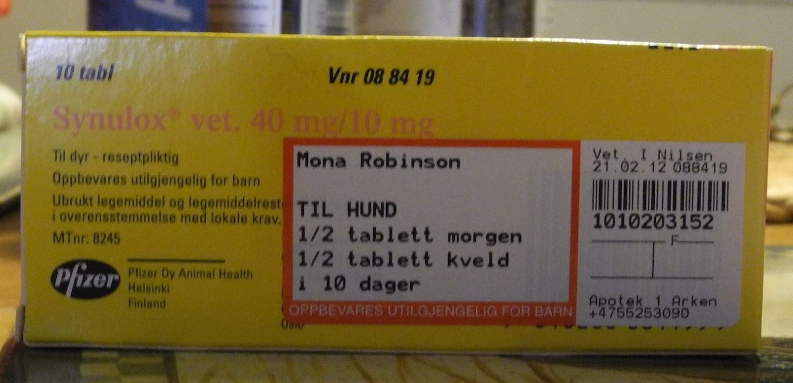 Nå er det 10 dagers antibiotikakur og lett diett med kokt kylling og eggerøre. Litt hundekuler men ikke mye. Vi har skiftet fra Eukanuba til Royal Canin og det ser ut til å falle mer i smak. Nå går all mat ned på høykant, hun virker nesten utsultet ! Stakkar, hun har kanskje hatt vondt i magen lenge uten at vi har visst det – kanskje derfor apetitten var så dårlig !