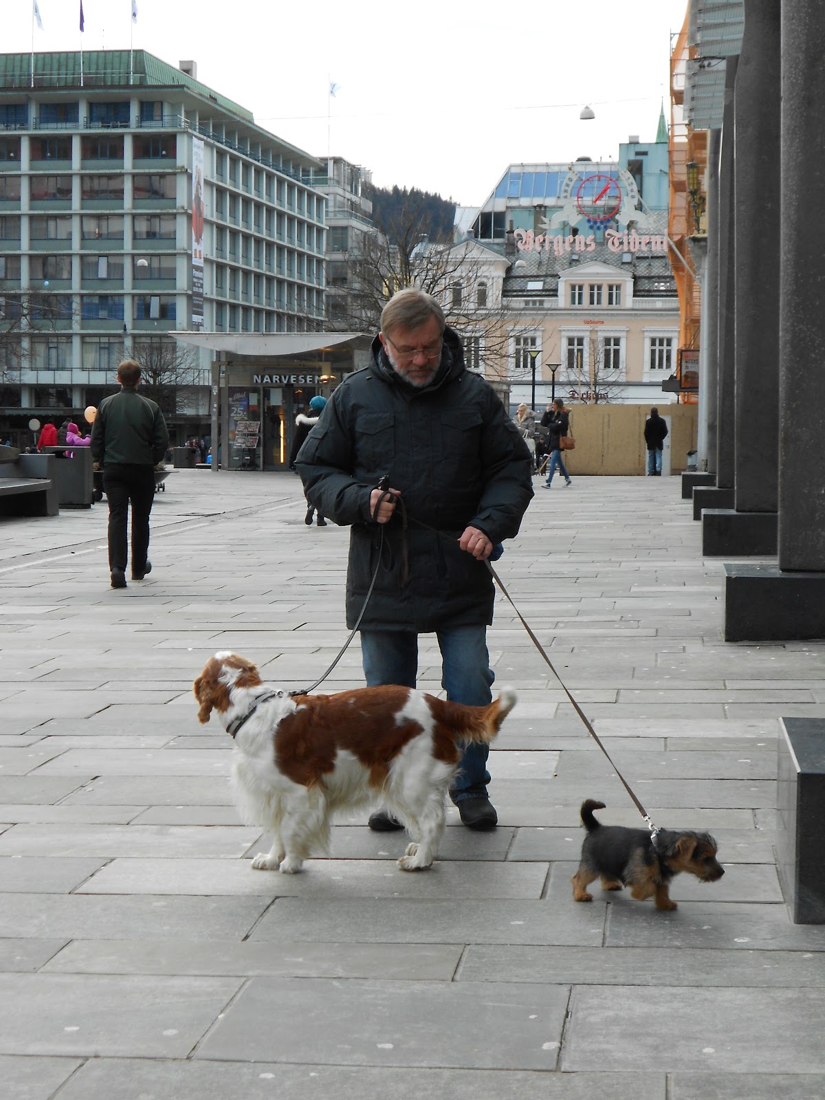 I byen gikk vi litt rundt på Torgallmenningen og studerte folk og fe. Morsomst av alt var det å jage duene, så var der noen unger som lekte på Ole Bull statuen utenfor hotel Norge som også var interessant. Og endelig fikk Maggie møte noen andre hunder, det gikk helt fint, hun ville jo bare leke, selv da vi traff en Bordeaux dogge hoppet hun opp og ville leke, da ble mor litt nervøs, han så jo ut som en som spiser valper til frokost, men eieren bedyret at «han er så snill».