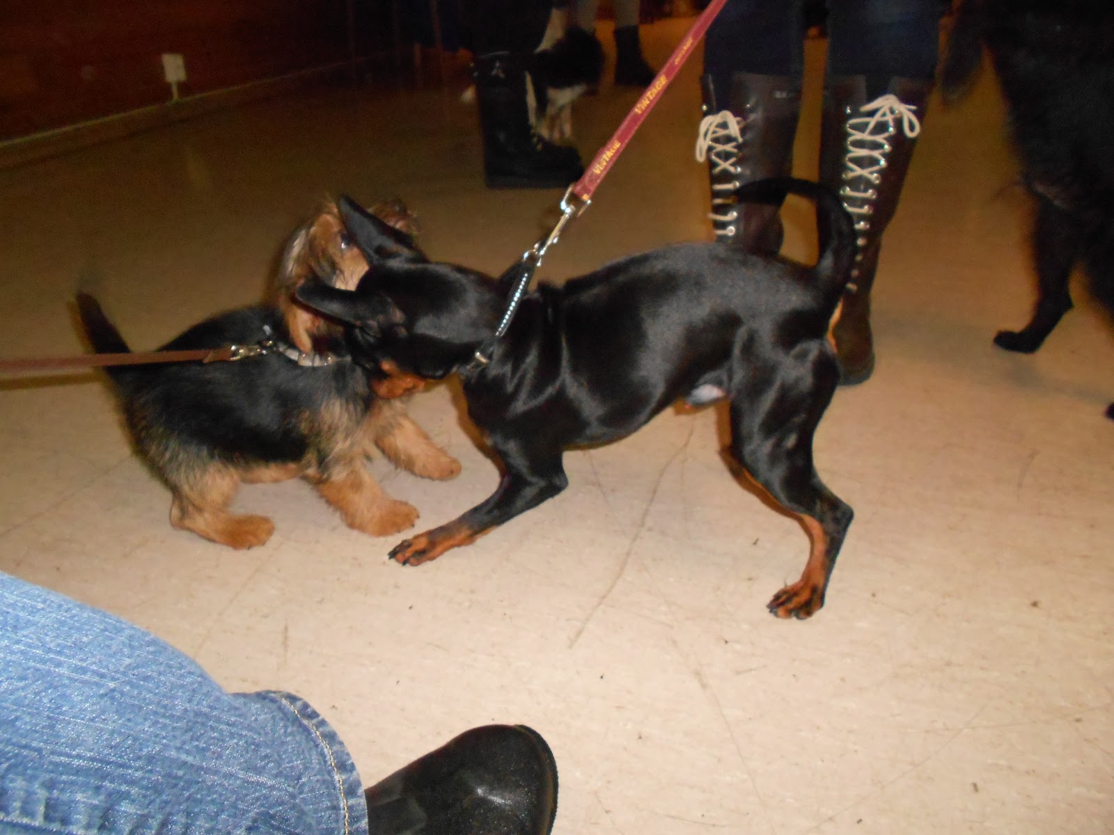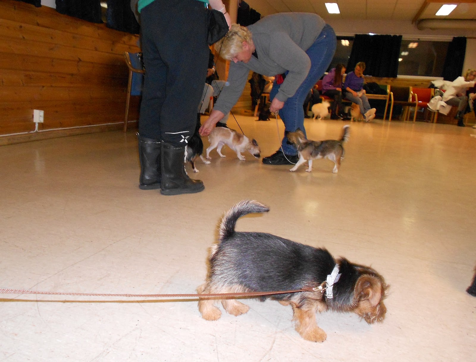 Om kvelden var det nok et «tiltak». Norsk Miniatyrhund klubb har sosialtrening for alle små hunderaser innendørs hver mandag. http://www.miniatyrhundklubben.com/ så vi besluttet å dra dit for at Maggie skulle få treffe hunder på sin egen størrelse. Vi kom sent og var der bare ca. 20 minutter, det var nesten for mye for henne. Rommet var omtrent fullt og mange av hundene bjeffet og bjeffet og bjeffet. Vi ble fortalt at det som regel ikke var så mange tilstede, men at mange hadde kommet for å trene utstilling til neste helg da det er utstilling på Manger. Og vi som trodde det ville være rolig ettersom det var vinterferie…………….