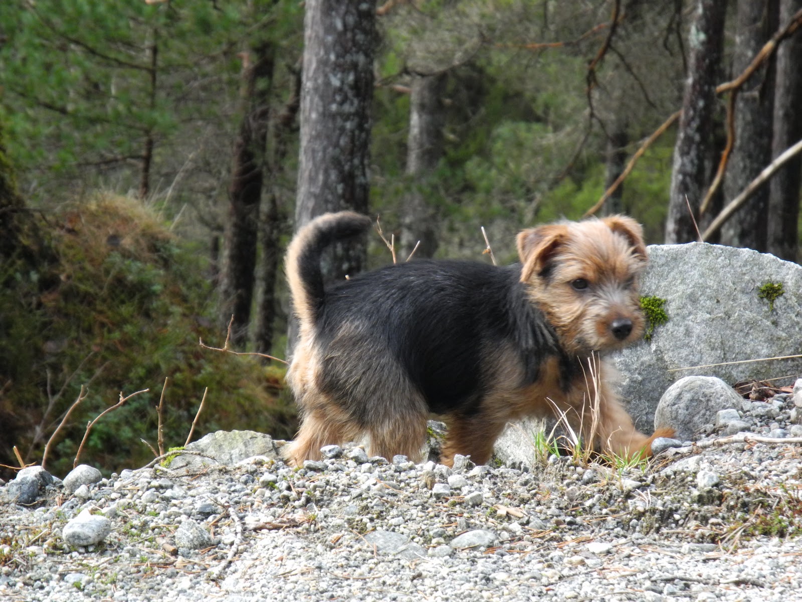 De høye fjellene gjør at solen FREMDELES ikke kommer ned til hytten. Så da det endelig ble litt sol i dag måtte vi opp i lien for å få litt etterlengtet sol. I gamle dager måtte vi ta beina fatt men nå er det ren luksus – flott skogsvei som vi kjøre opp de bratteste kneikene før vi parkerer og går videre til fots. Vi har med termos og nystekte muffins så dette er riktig kos. Kan jo ikke gå så veldig langt med «småtten» så vi finner oss en fin stein å sitte på og kose oss for å nyte medbrakt og la hundene tutle rundt og snuse.