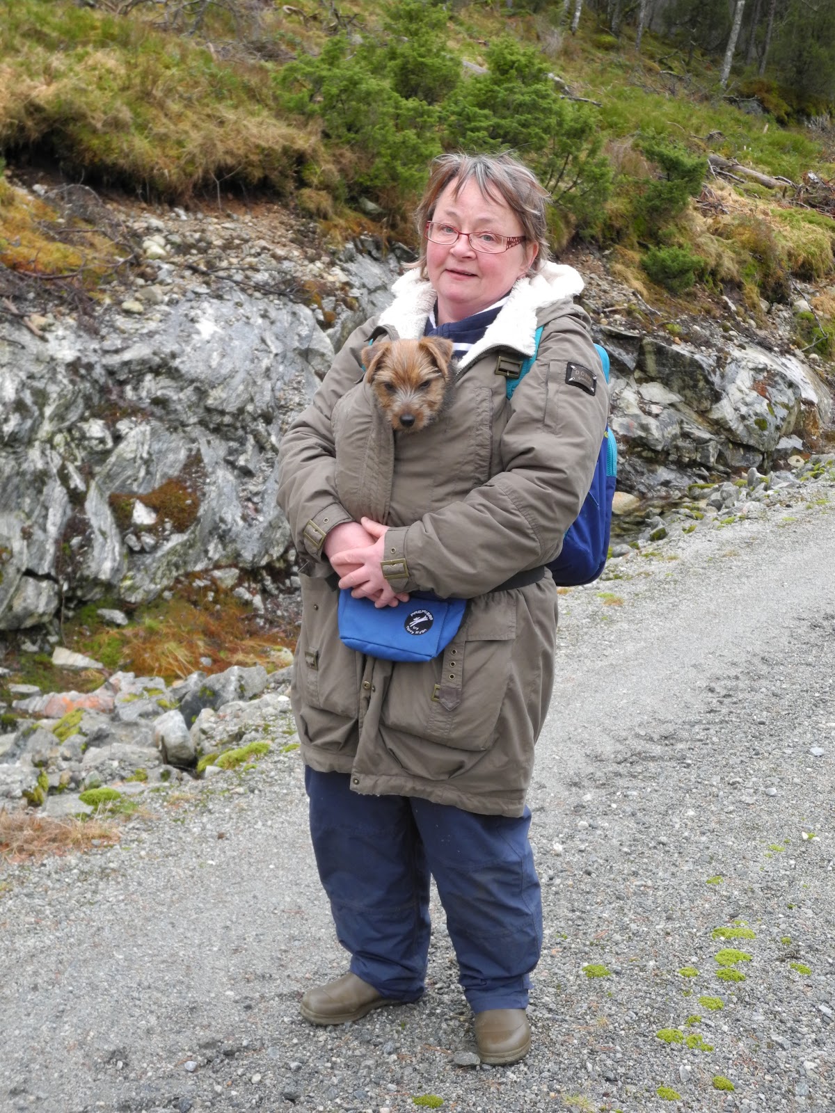 På hjemveien fikk vi litt dårlig samvittighet for at vi hadde gått for langt med Maggie så da fikk Mona leke kenguru og ta henne med under parkas’en. Riktig koselig, og varmt ble det sannelig ! Som å gå med en varmepose på brystet !