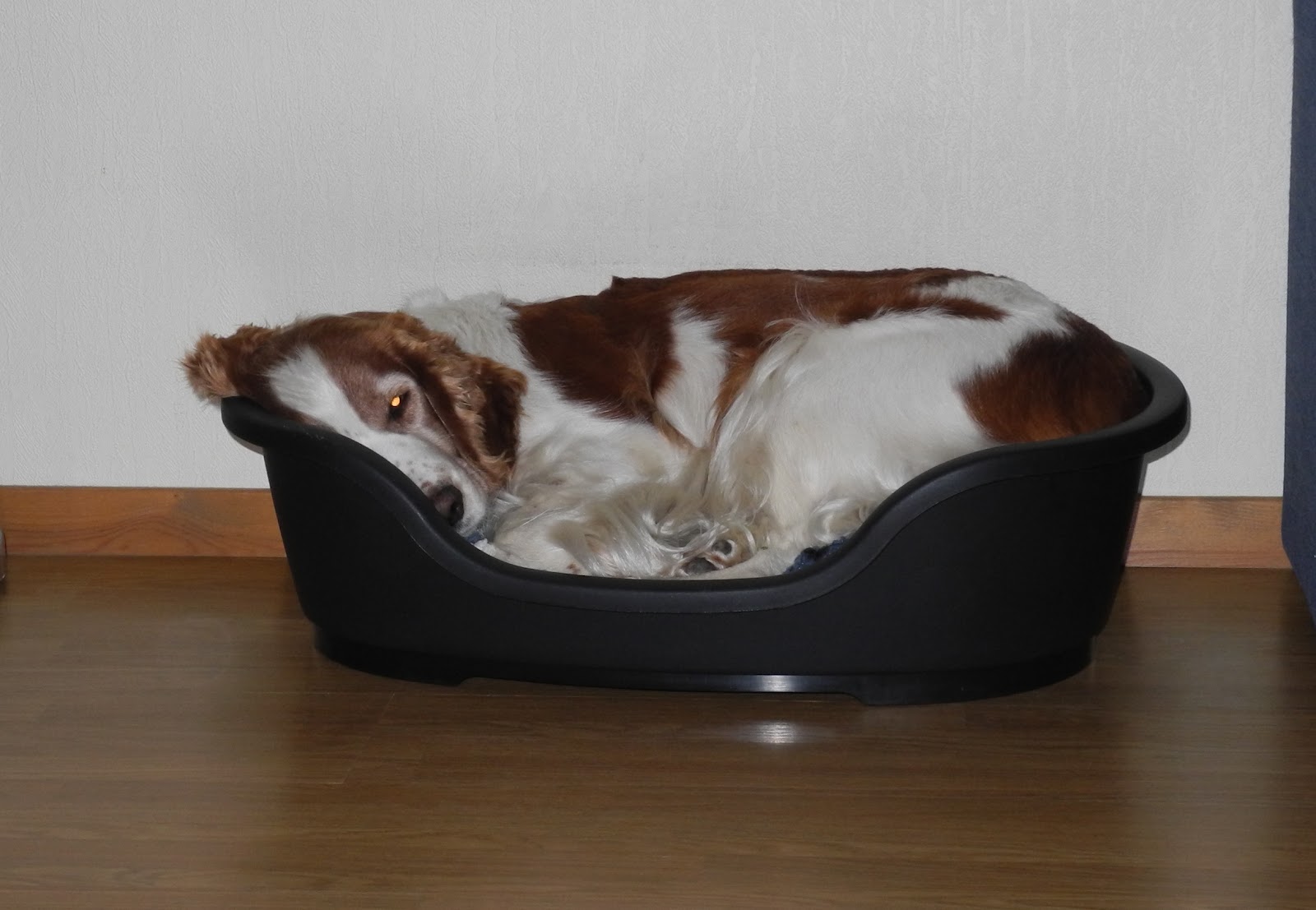 Få hunder har så mange senger som våre vil vi tro. I stuen har de hver sin seng, en kjempestor til Pegi (egentlig beregnet til 2 springere) og en liten seng til Maggie (liten men stor nok til at hun kan ha den som voksen).