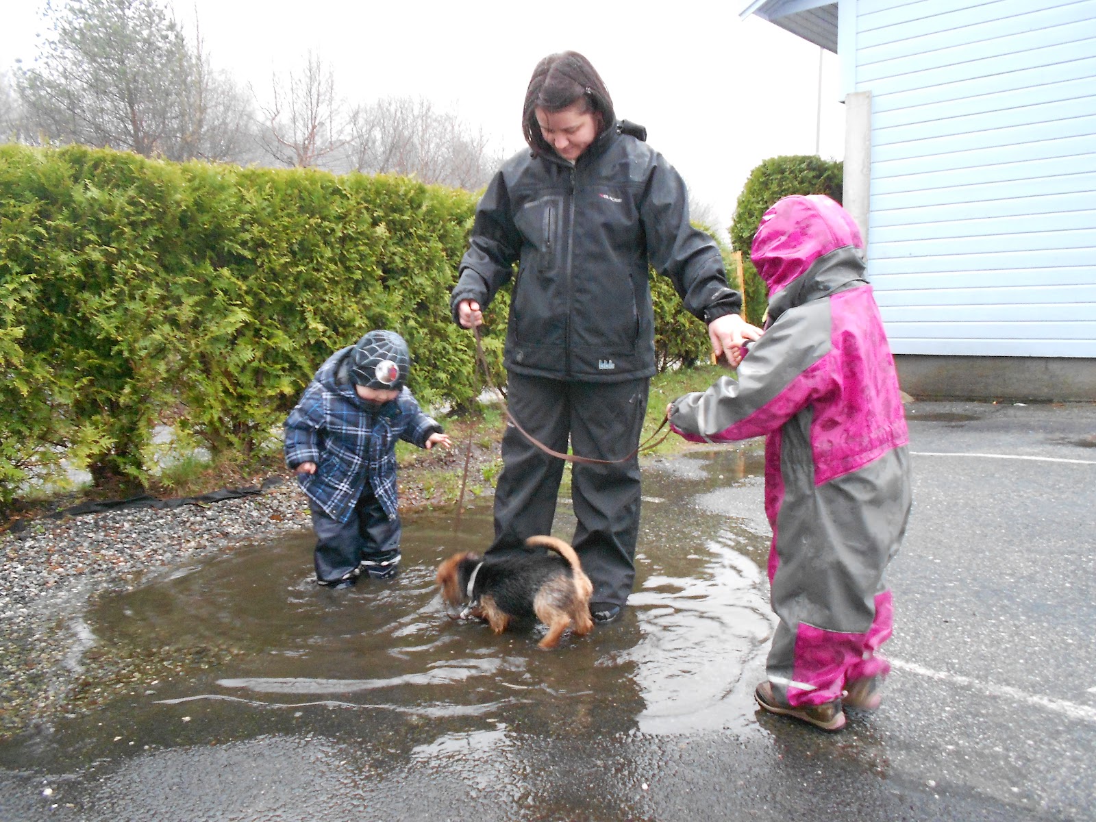 Vi hadde også fint besøk. Suzanne, Lizzie og Scott kom rett fra barnehagen til middag. Og etter middag var det ut på tur med Maggie hvor turens høydepunkt var å leke i dammen utenfor garasjen. Og været var det samme her som under det kongelige besøket tidligere på dagen. Og akkurat som Sonja måtte mormor også ta på sydvesten men det kom aldri med på bildet for damen med sydvesten var bak kamera (som vanlig)