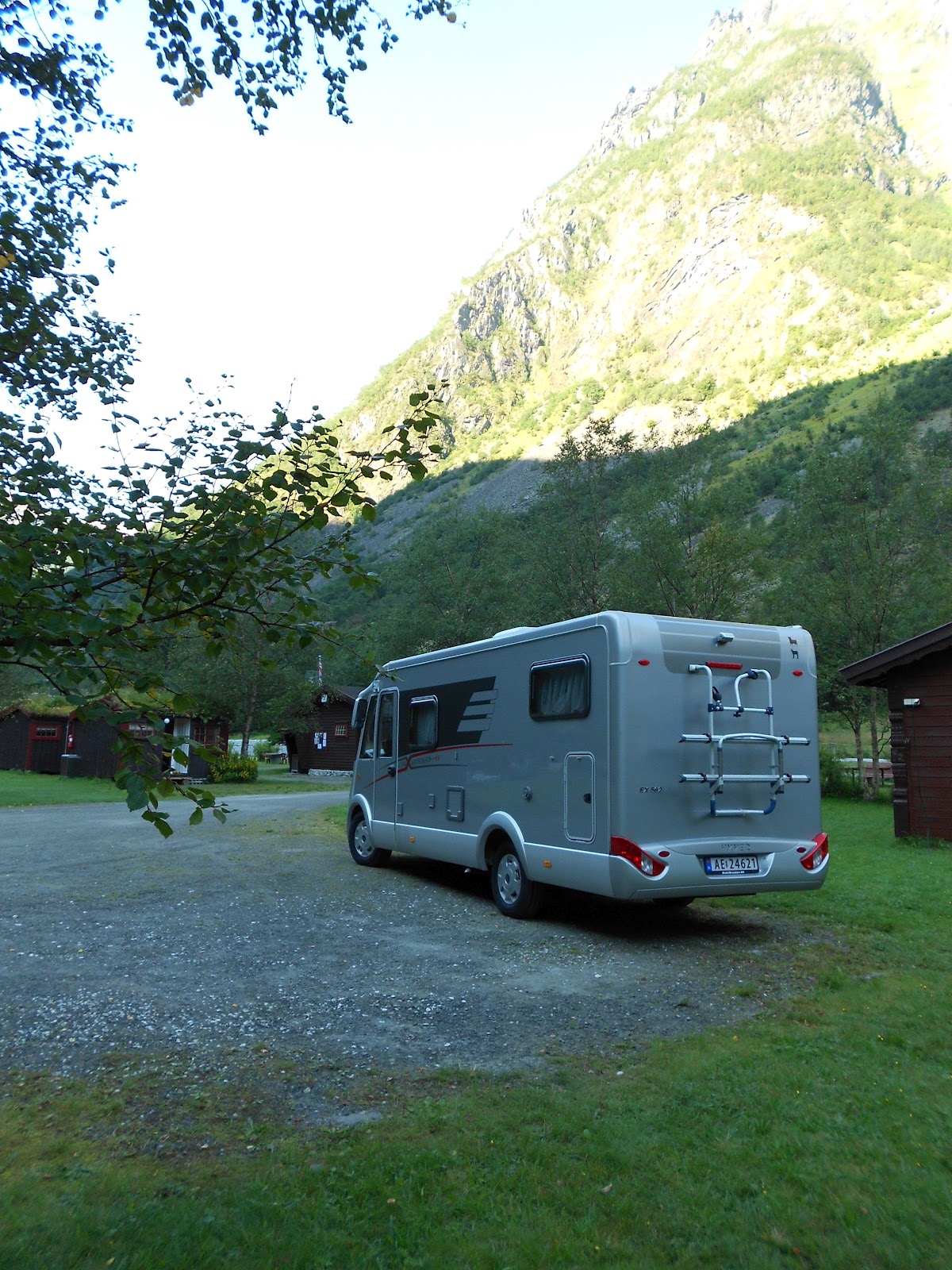 Vi hadde egentlig lyst til å ha første overnatting på Voss ved den fine campingplassen ved vannet nede på selve Vangen – men vi hadde en mistanke om at det denne uken var Landsskytterstevne her og riktig nok – det var stevne ja. Men likevel hadde de plass på campingen – men vi ser at prisen var satt opp en ekstra hundre kroner fordi det var stevne. Så det syntes vi var dumt, vi var jo ikke der for skytterstevne akkurat. Så vi valgte å dra videre. Stopper på Vang camping i Gudvangen og oppdager for sent at her ikke er fasiliteter for bobil. Hverken dotømming, gråvanntømming eller vannslange. Dette må du kjøre 900 m ned på bensinstasjonen for. Da lurer du jo på hva du betaler 190 kr for ! I tillegg er solen forsvunnet (kl. 20.30) – og da vi reiser neste dag (kl. 10.00) oppdager vi at solen fremdeles ikke er kommet ned på campingplassen. Goodbye dødsskyggens dal – siste gang vi overnatter her.