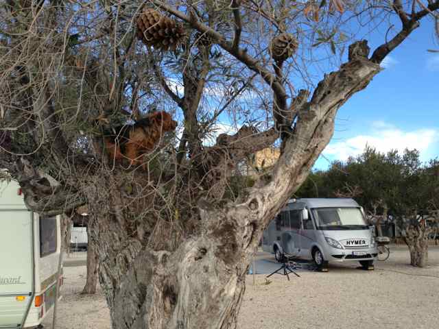 Tok ingen bilder i dag så vi får bruke et lite arkivbilde av Maggan som klatrer i oliventreet utenfor vognen. Vi trodde først det var oliven hun var ute etter – men det var nok kattelukt vil vi tro. Her er en del katter som romsterer rundt på campingplassen.