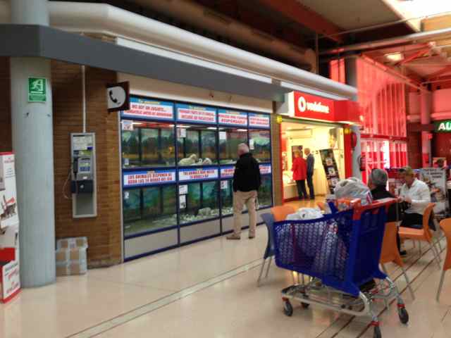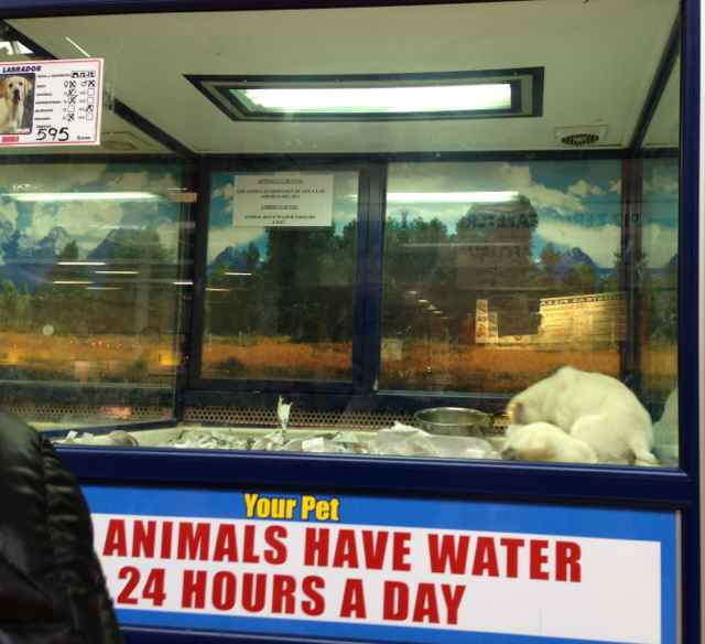 Og så har vi omsetning av valper. Det foregår tydeligvis i dyrebutikker. Her er små valper oppstallet i glassbur på utstilling. Noen er heldig og har en kullbror eller søster å holde seg med selskap, mange står alene. Og her holder de til hele butikkens åpningstid. Hvor de er om natten anes ikke, har ikke turd å gå inn å spørre. Og hvor mye menneskelig kontakt de får må gudene vite. Og her er vi norske oppdrettere som nutter og dutter med valpekullene våre på kjøkkenet og likevel klarer vi å produsere den ene nevrotiske umuliussen etter den andre. Og så ser du disse valpene her – er det de samme som vel fornøyd tripper etter eieren sin på strandpromenaden – avslappet og fornøyd ? Ikke vet vi. For oss hundeelskere er det uansett grusomt å måtte gå forbi disse akvarieburene – slik som Mona måtte i dag da hun var på Carrefour shoppingsenter og der sto de – mellom kafèen og telefonbutikken. Uff og uff.