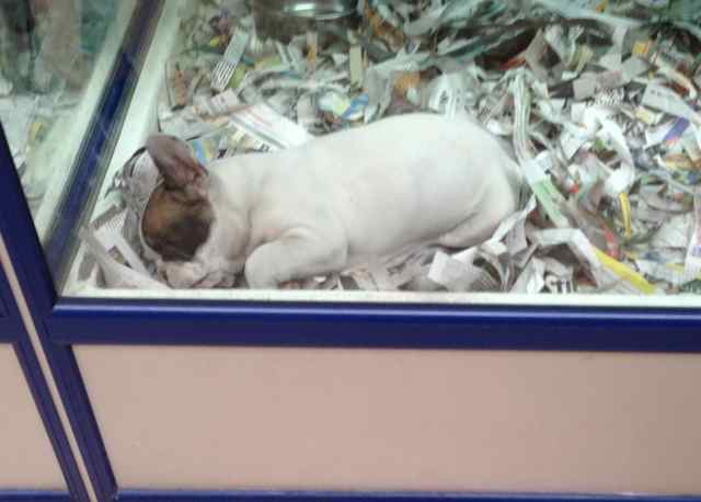 | Denne franske bulldoggen var 3 mnd gammel. Hvor lenge har han bodd i glassuret mon tro ? |