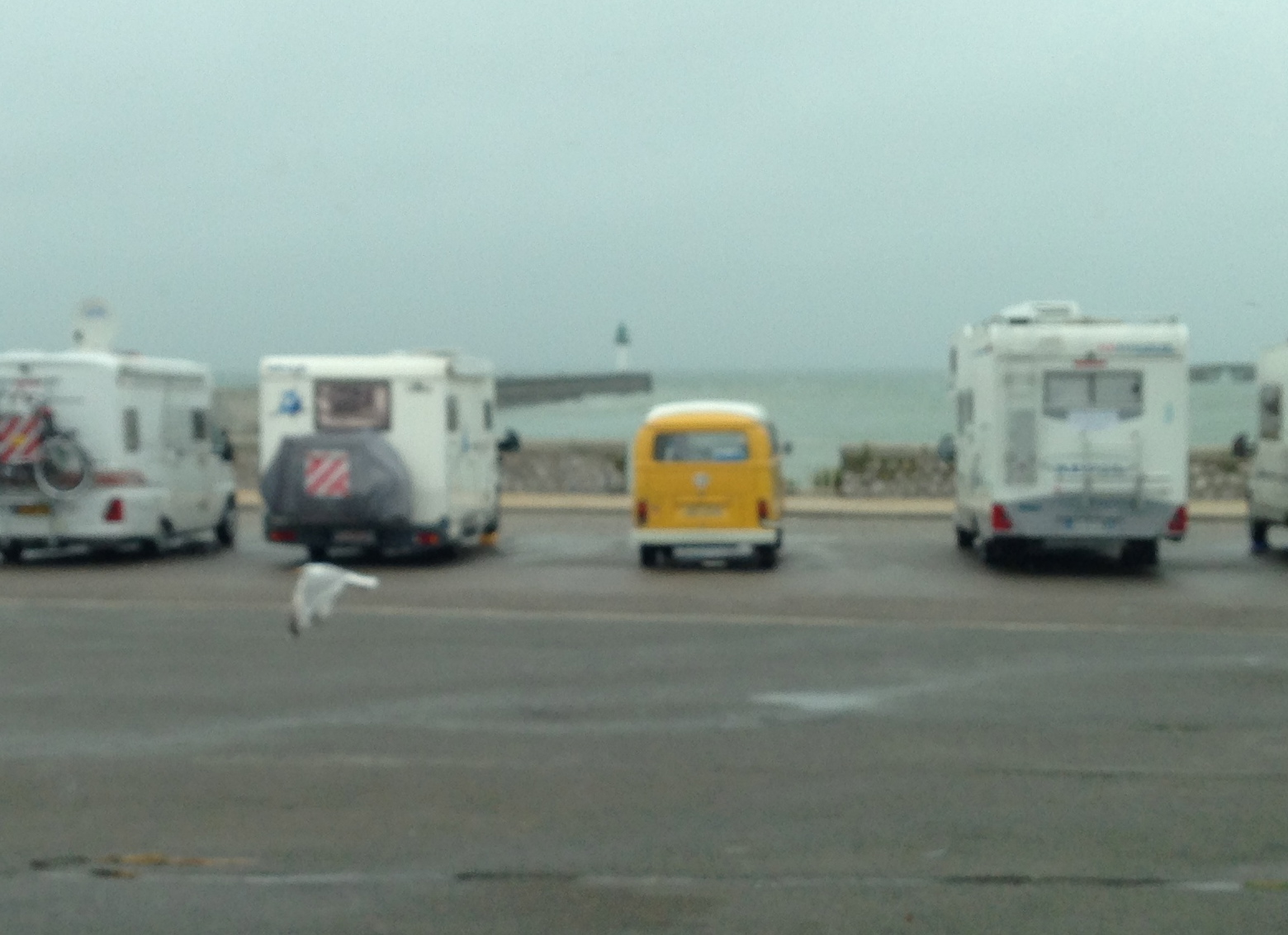 Kommer til Calais i femtiden og det regner og blåser. Ordentlig surt. Men vi klarte nå endelig å få plass på camperstoppen ved stranden (hvor det alltid har vært fullt før) slik at Mona kunne kose seg med å se på de hvite toppene på sjøen og glede seg til morgendagens overfart.