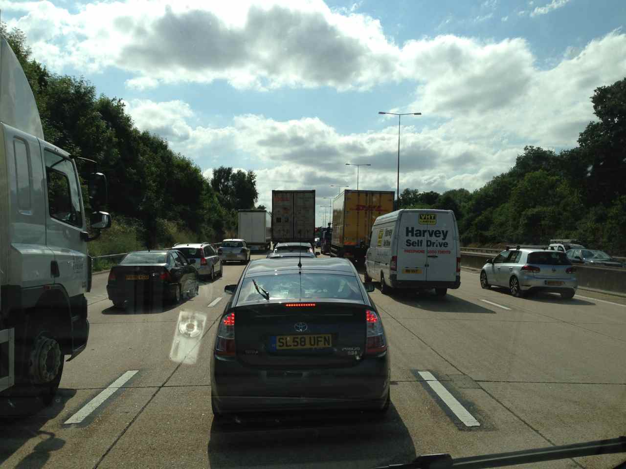 Så da papirene for taxfree’en var unnagjort var det bare å dra videre. 1 time og kjøre i dag, men det ble minst 2 takket være DEN køen på M25. Det var så gale at det var omtalt på radioen.