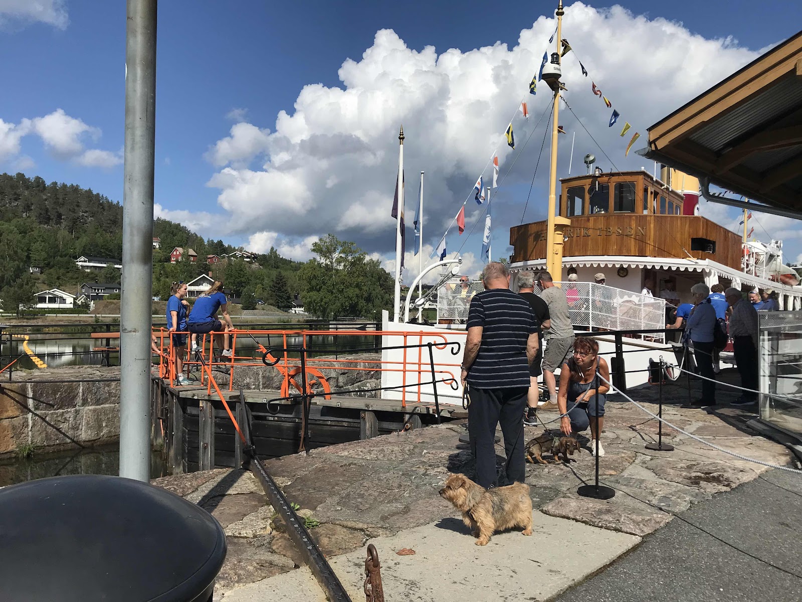 Og fint og idyllisk var det. Stor campingplass (mindre enn halvfull for øyeblikket) rett ved slusen der det også var en kafè. Vi ankom rett før dagens stor happening: kanalbåtene «Victoria» og «Henrik Ibsens» passering av slusen. Den ene på vei opp og den andre på vei ned.