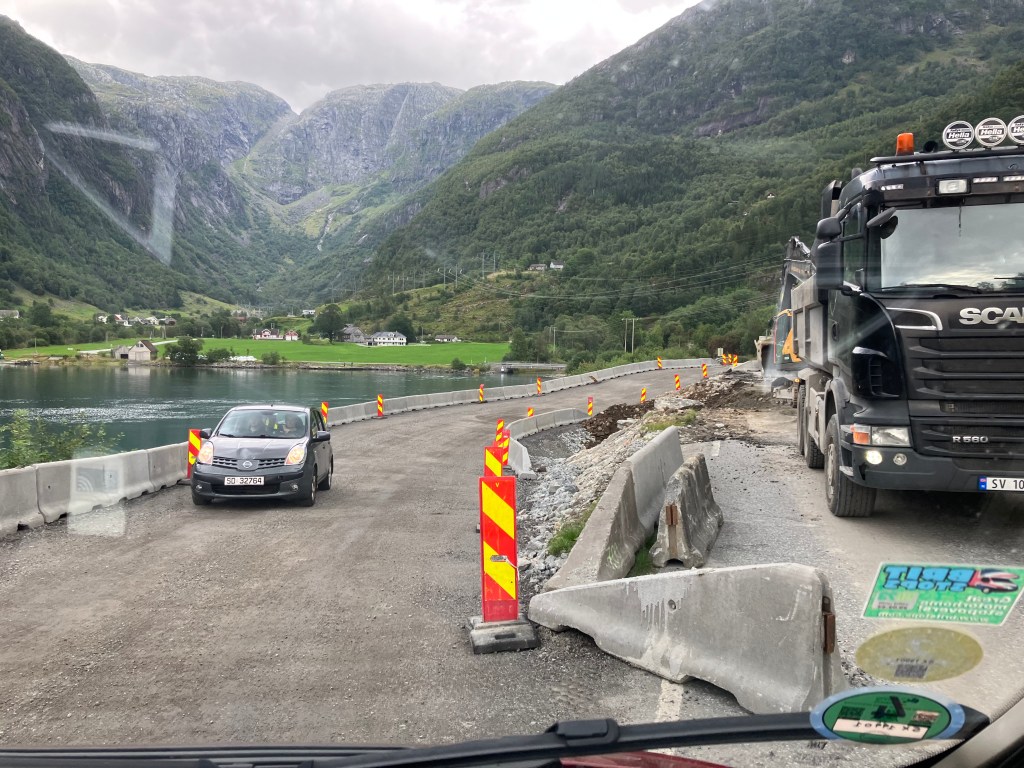 Så klokken ble 3 før vi forlot Åsane. Fint vær og fine veier første del av turen. Da vi kom til Gjermundshavn ble det vel en halvtime å vente på fergen og da vi kom på andre siden var det veiarbeid og atter veiarbeid med mye venting og hullete veier.