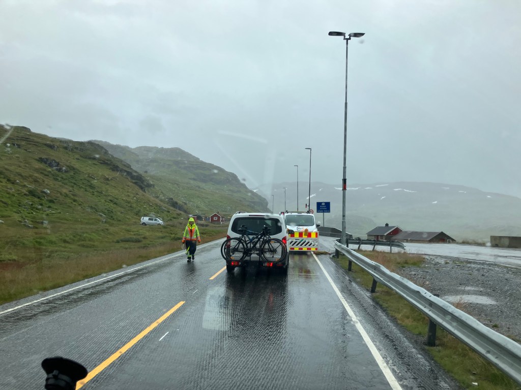 Ja feriestarten ble nå heller ikke noen dans på roser for oss to-beinte heller. Regn er vi nå vant med og vi satt jo i en varm og tørr bil, men det var det endeløse veiarbeidet som irriterte oss. Men det må vi vel finne oss i skal vi få bedre veier. Vi hadde såvidt startet i dag morges fra Røldal da det ble full stopp og 20 minutters venting på ledebil gjennom tunnellen – som kjørte i omtrent 30 km fart. Og slik fotsatte det stort sett gjennom hele Telemark bortsett fra her var det automatisk lyskontroll du måtte rette deg etter.