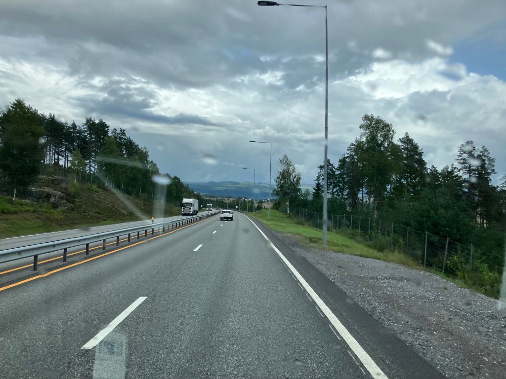 Regnet bedret seg når vi kom på østsiden av vannskillet og da vi stoppet for en litt sen lunsj utenfor Kongsberg fikk hundene en fin liten tur i skogen. Så bar det videre mot Drammen hvor det var rush tid og trafikken sto omtrent stille. Men da vi tok av mot Oslofjord-tunnellen gikk det bedre. Trafikken gikk greit på E6 i Østfold bortsett fra en hinsides styrtregn-byge hvor vi måtte kjøre i 40 km istedet for 110 for å klare å se noe. Trailerne kjørte med nødlysene på og vi hadde en lengre diskusjon om hvor vårt tåkelys var, men før vi fant den var regnbygen over like rask som den hadde begynt.