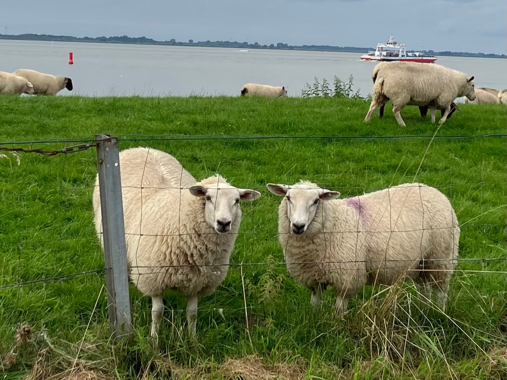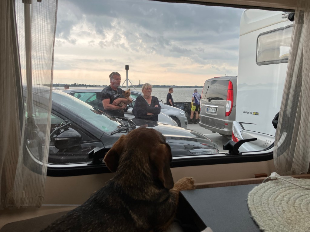 Langs veien ned mot fergekaien gikk det sauer på beite og ettersom vi måtte vente i 40 minutter (vi kom med den 3dje fergen) fikk hundene god anledning til å få sniffet på sauene som syntes veldig nysgjerrig på våre 2. Det er 20 grader i dag og bare deilig å vente på ferge.
