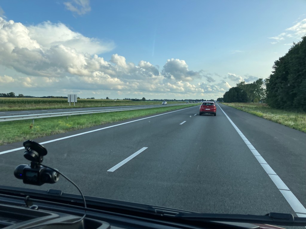Fine relativt rolige veier. Veldig lite autobahn i dag, fikk faktisk ikke ordentlig motorvei før vi var kommet til Holland. Men det var jo kjekt til en forandring, med ferge og landeveier istedet. Tordenvær fikk vi også – 3 tordenbyer hvor det høljet – men sluttet nesten like brått som det hadde begynt.