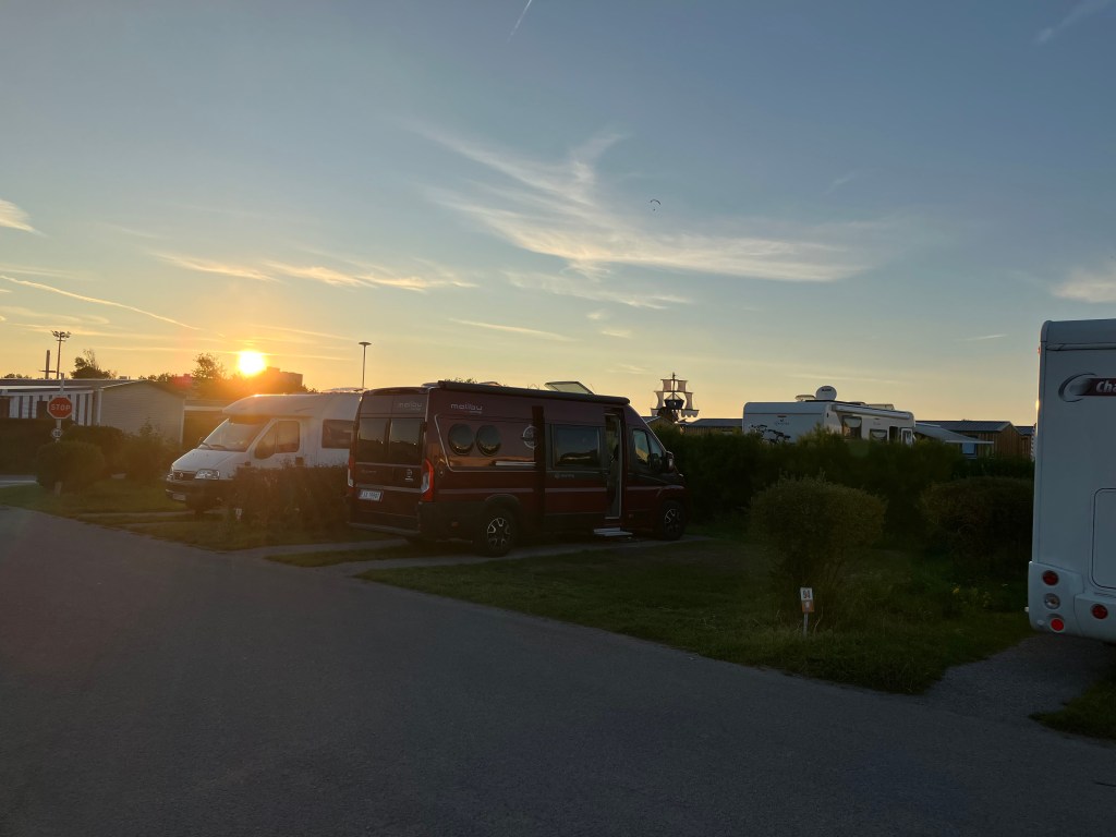 Så kom dagens andre festlige. Vi hadde valgt en camper stop i en liten badeby øst for Dunkerque som overnatting. Dette er et sted som tilhører en fransk camping club vi er medlem av hvor du kan booke på forhånd. Dette var en liten plass med 18 plasser og Mona forstod det slik at det var 18 plasser ledig. Ray syntes dette var litt mistenkelig så han mente vi kunne bare la vær å booke og ta en titt på stedet først.