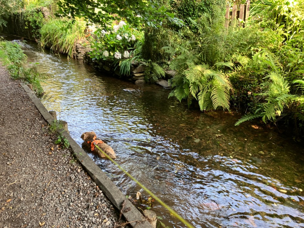 Langs en av de små smauene renner det en kanal med krystallklart vann. Det er akkurat passelig vasse-dybde for Maggie så hun vader i veg flere ganger for dagen. Albert betakker seg å bli våt, men så har nå han tynn pels og elsker varme. Men vi har lempet han uti et par ganger.